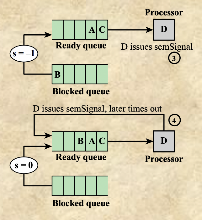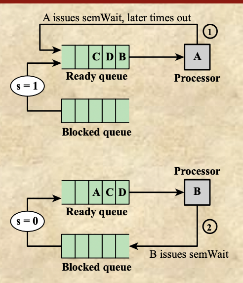 - 초기 세마포어값은 1이다. A가 processor로 들어간다. semWait을 통과하여 자원을 할당받고 critical section으로 진입한다(이때 s=0). 그러나 정해진 프로세서 타임을 소모하면 A는 다시 ready queue로 들어간다. 아직 A가 자원을 다 사용하지 않았다. 즉 semSignal이 호출되지 않았다.