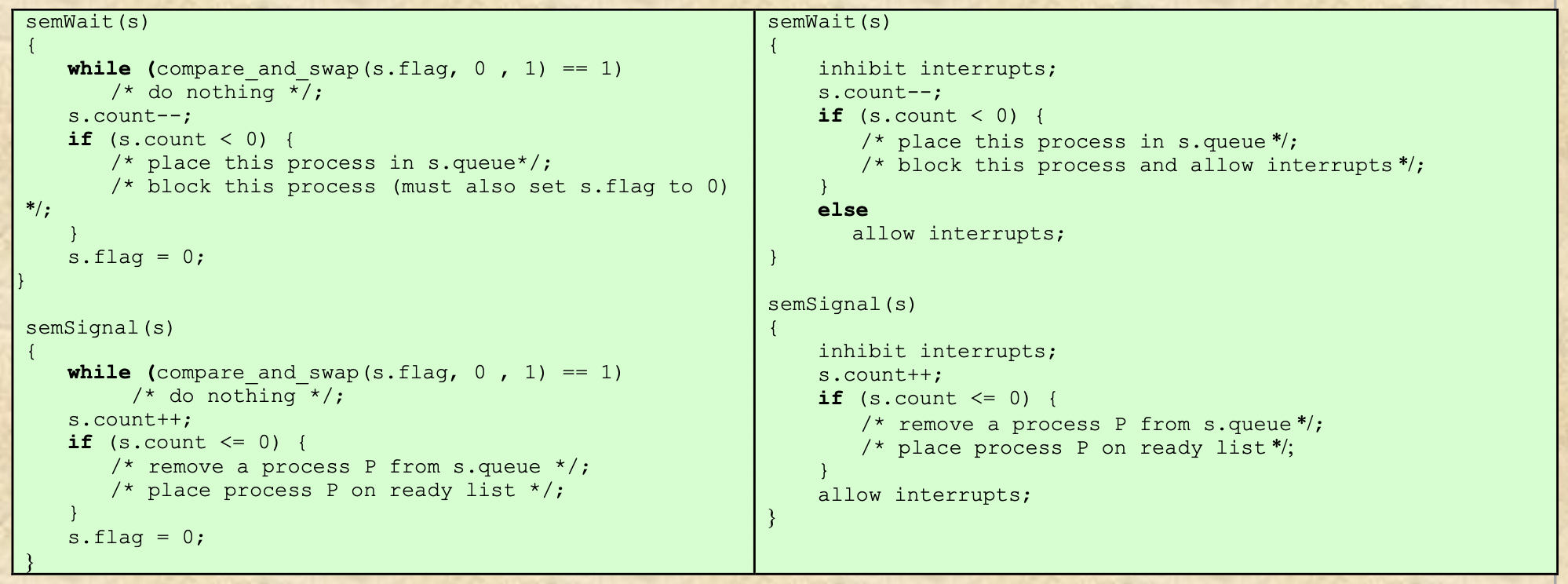- 두번째 방법은 semWait, semSignal이 실행될 때 interrupt를 금지시키는 것이다.