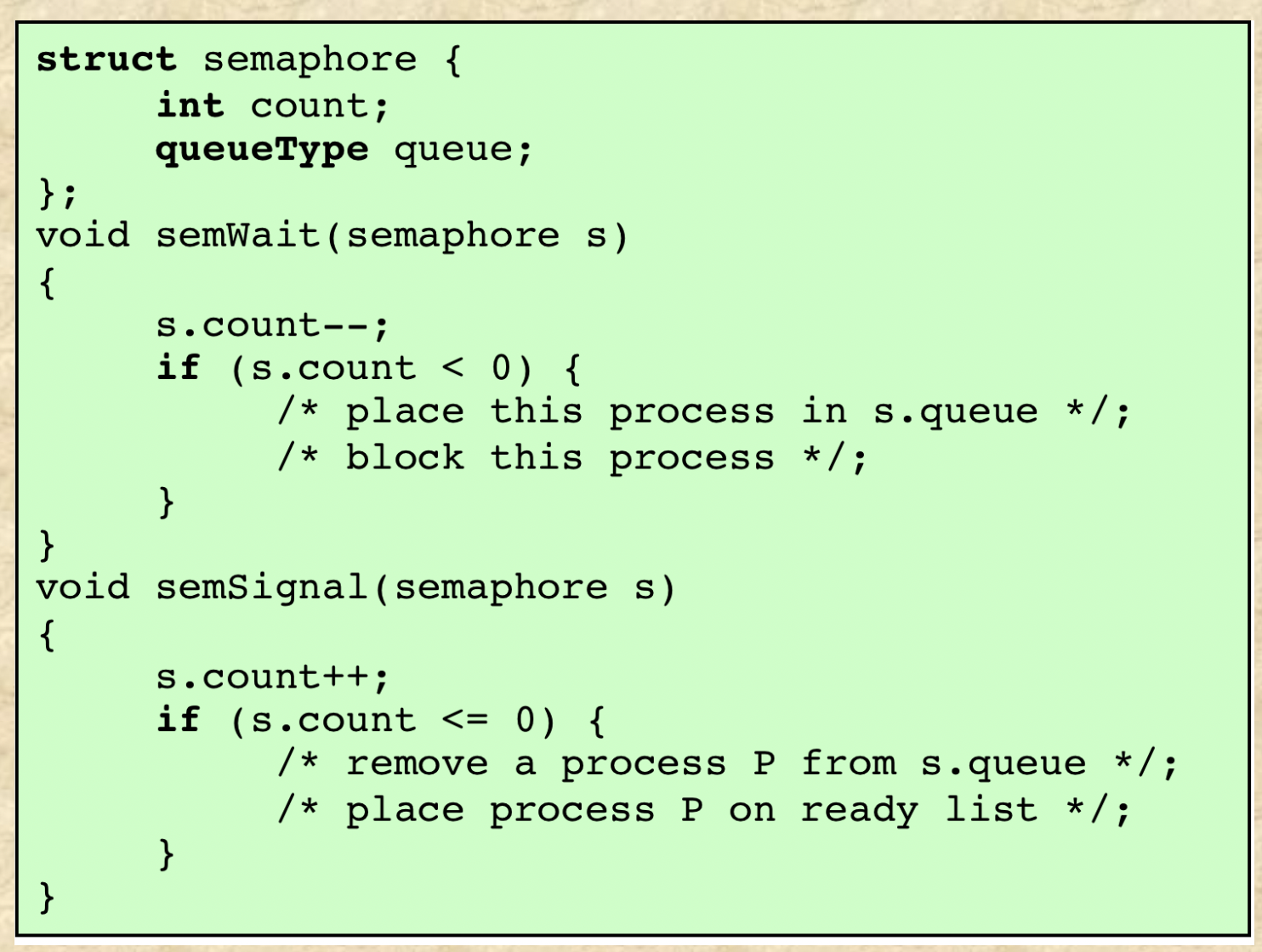 - 첫번째 프로세스가 semWait을 호출하면 count가 0이 되고 if문을 뛰어 넘고 자원을 할당 받는다.
