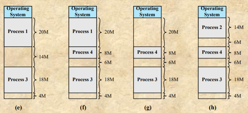 - 이런 방식에서는 문제점이 하나 있다. 8M씩 메모리 공간을 할당 받았는데 프로세스들이 5M, 1M, 8M 만큼 메모리를 쓴다면 낭비되는 부분들이 생긴다. 이것을 internal fragmentation이라고 한다.