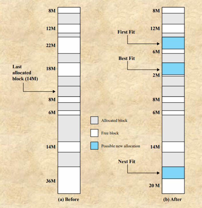 - 메모리 할당을 기다리는 프로세스(16M필요)가 들어갈 위치를 fisrt-fit, best-fit, next-fit방법으로 찾아보자.