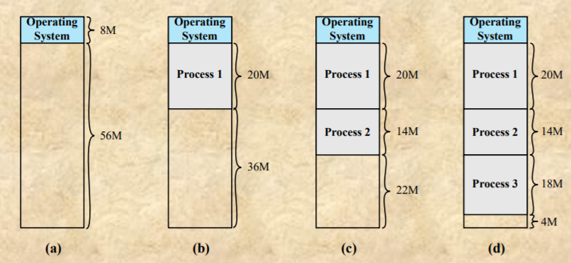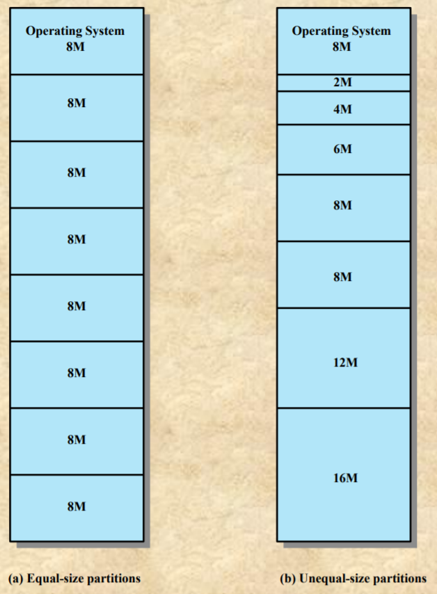 - 메모리 공간을 똑같이 8M으로 나누어서 프로세스들에게 나누어 줄 수도 있고 프로세스들의 크기가 다름을 고려하여 크기를 다양하게 파티셔닝할 수 도 있을 것이다.