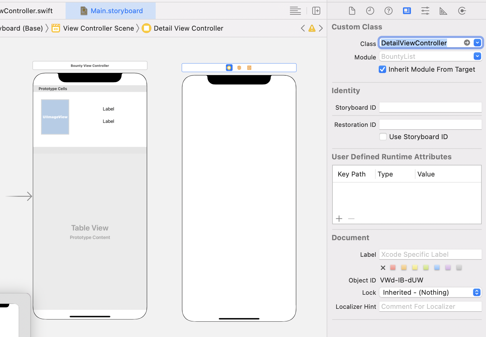- storyboard에 새로운 View Controller object를 추가하고 이전에 만들었던 DetailViewController class와 연결한다.