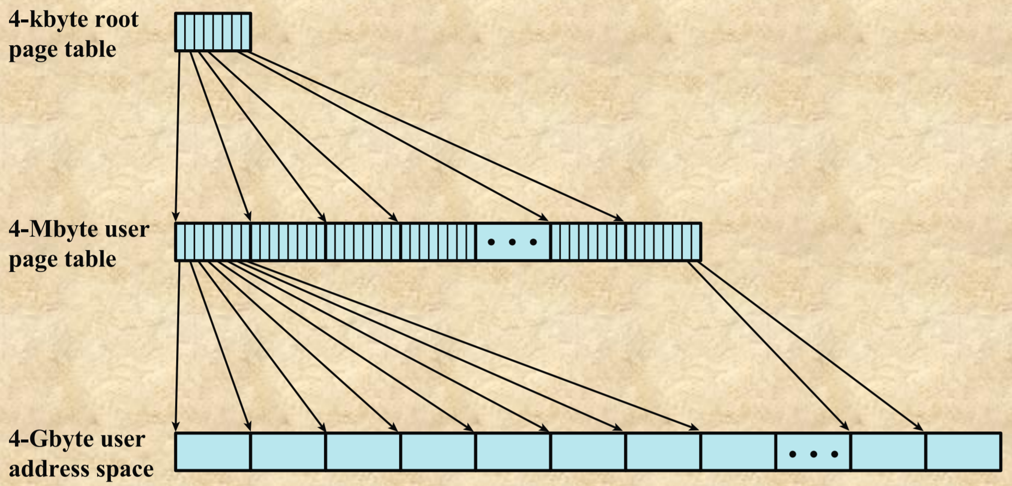 - 첫번재 10bit로 root table에서 frame number를 찾으면 4KB page table에서 두번째 10비트로 최종 frame#를 찾아 offset을 덧붙여 실제 주소를 찾는다.
