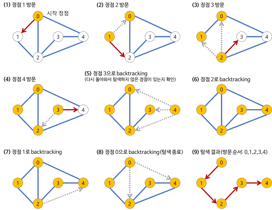 - 모든 노드를 방문할 때 까지 탐색이 반복되는데 시작 노드로부터 나아갈 길이 없을 때까지 깊이 우선으로 방문을 시도한다.