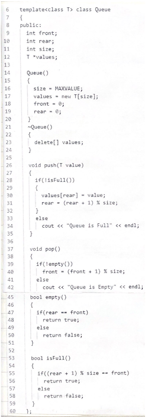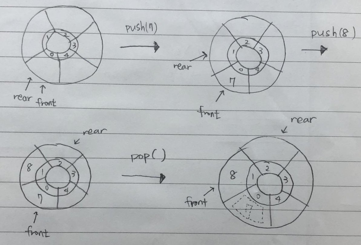 - 원형 큐가 가득 차 있음을 표현하기 위해 배열 끝 칸은 저장용으로 사용하지 않는다. 그래야 (rear+1)%size == front로 IsFull()을 만들 수 있다.