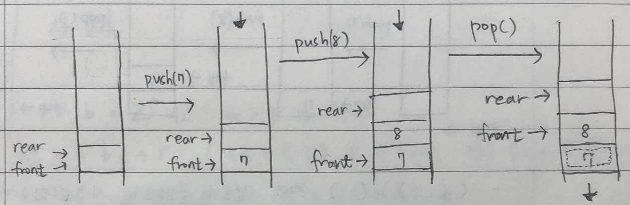 - 문제점 : rear, front는 계속 증가만 한다. 나중에 한정된 메모리 끝에 rear가 도달 했을 때, 사실상 메모리에 비어 있는 공간이 있을 수 있다. 즉, int 100개 만큼의 메모리를 할당해도 100개의 정수를 넣기도 전에 rear가 끝에 도달 할 수 있다.