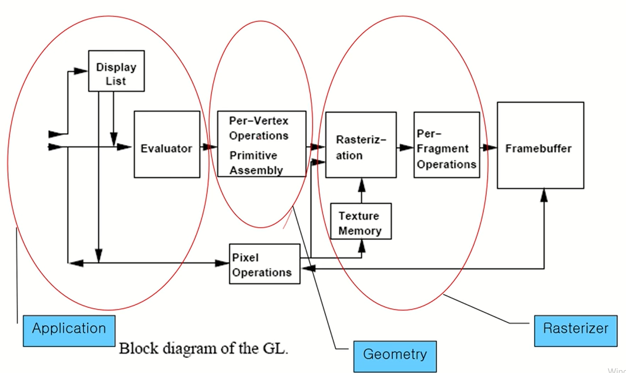 - Model Transformation, View Transformation, Lighting, Projection, Clipping, Screen Mapping,등의 작업들이 이루어진다.