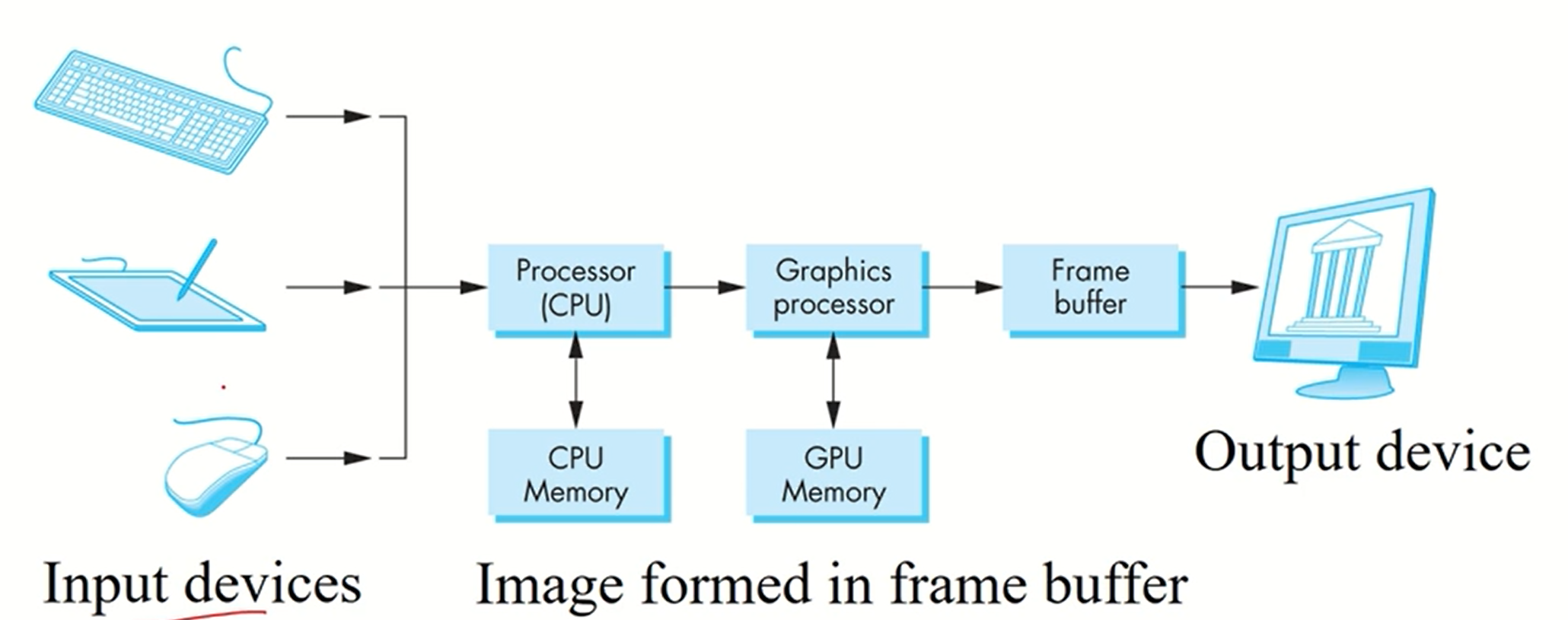 - cpu로부터 받은 데이터를 가지고 gpu가 픽셀 값들을 계산하고 그 pixel 정보들을 frame buffer를 통해 출력한다.