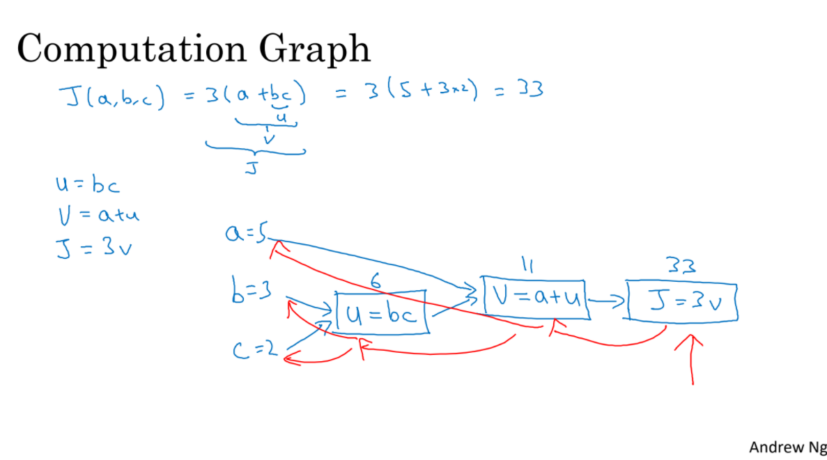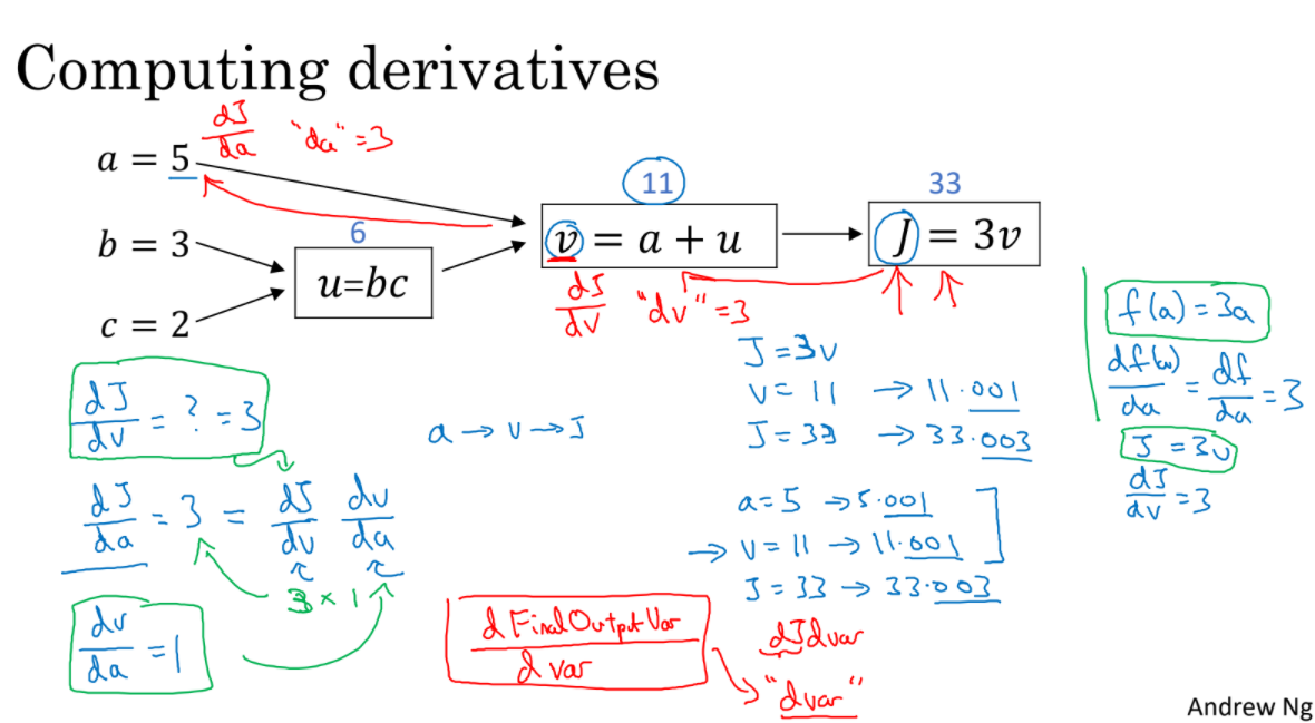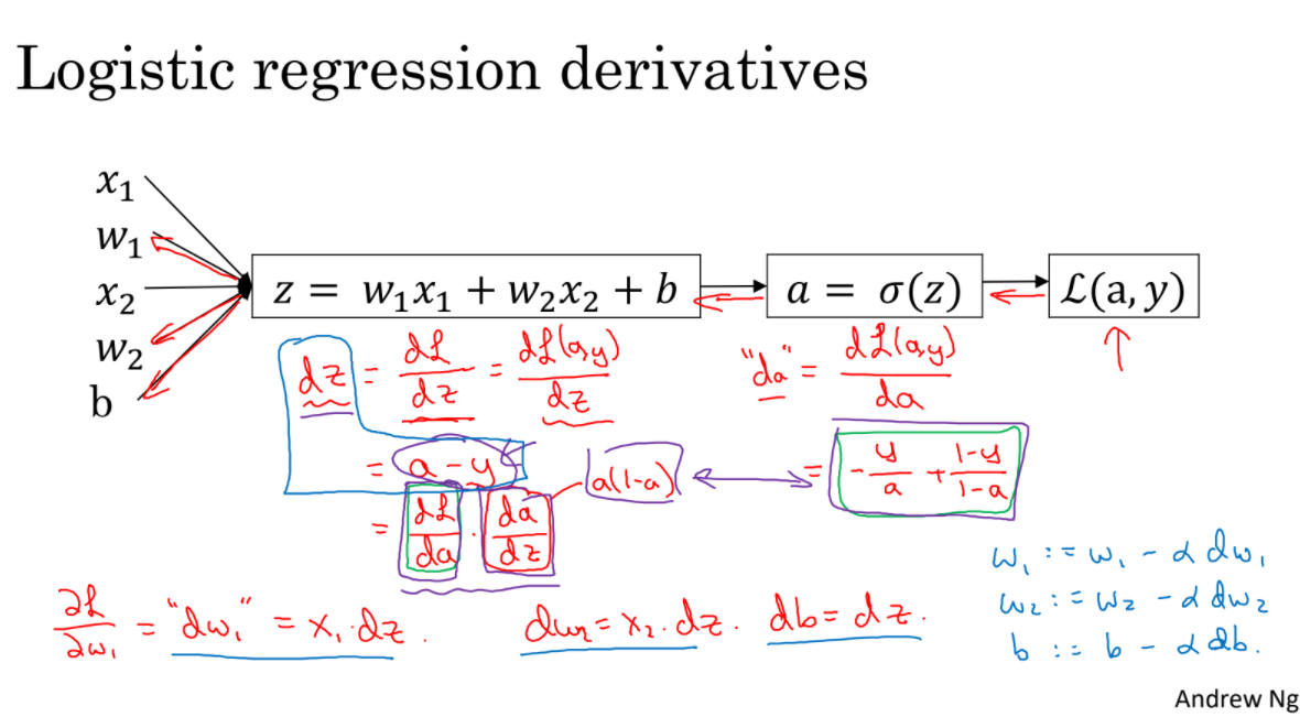 red 화살표는 backward propagation으로 gradient를 계산한다. 이를 사용하여 최적화를 위해 w,b를 재갱신한다.1. dj/dv를 구한다. 2. dj/da를 구한다.3. dj/da = dj/dv * dj/da (chain rule)이렇게 우측에서 좌측으로 이동하며 계산을 마친다.