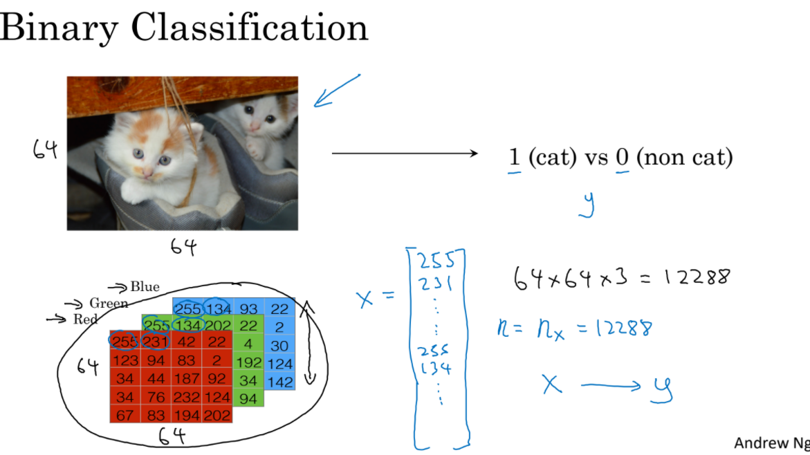 사진을 입력값으로 받고 고양이인지 강아지인지 판별해야 한다. 컴퓨터는 사진을 색 정보를 지닌 세 matrices로 이해한다. 이 세 matrices를 하나의 input feature vector, x로 만든다.