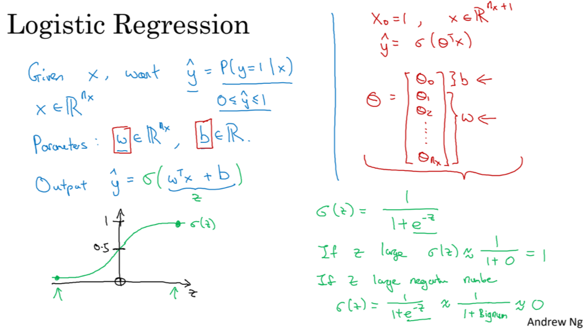 (파랑) binary classification 문제에서 사용하는 learning 방법이다. X가 주어졌을 때 w, b parameter를 함께 넘겨서 y^을 찾는다. 하지만 이 방식에서는 y^이 0, 1사이로 결정 되지 않는다.