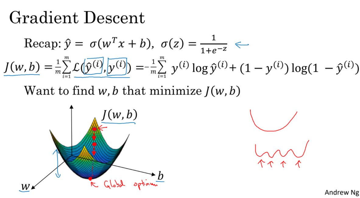 cost function J(w,b)를 통해 cost를 구했다. training을 통해 이 cost를 최소화 하기위한 w, b를 찾아야 한다. 그래프는 w, b에 따른 cost를 나타낸다.