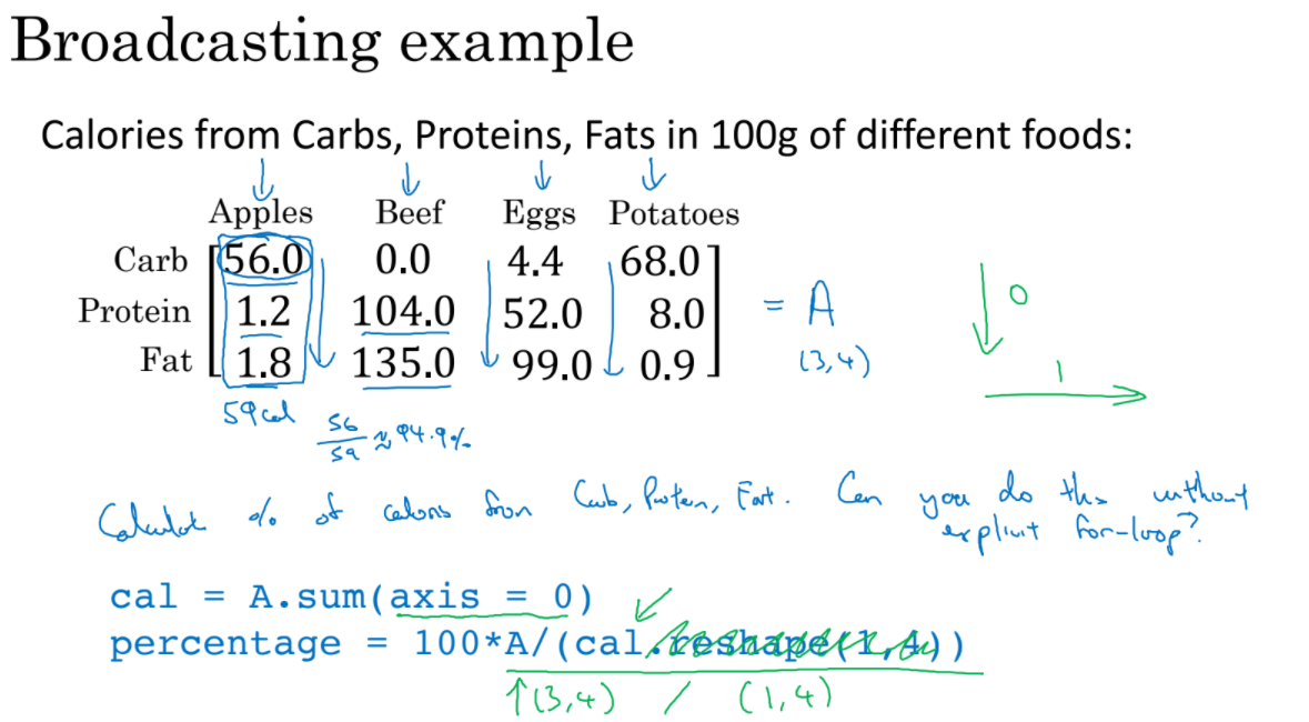 broadcasting으로 python code를 더 빠르게 할 수 있다. for loop 없이 matrix 연산을 더 빠르게 구할 수 있다.