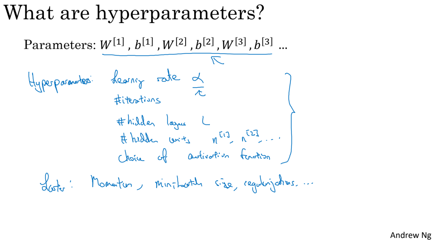 - learning rate alpha. activation function, #hidden layer 등 최종 w,b를 조정하기위해 많은 매개변수들이 사용된다.