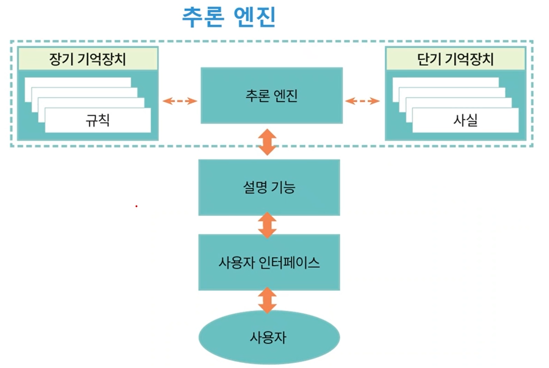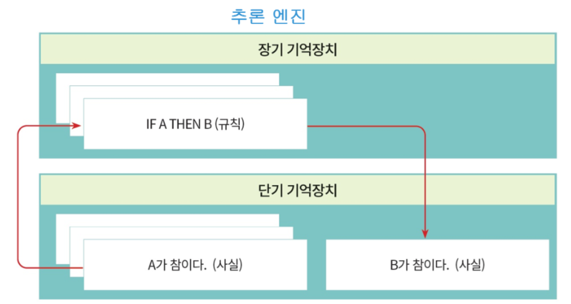 - 추론 엔진은 사실과 규칙을 가지고 새로운 사실들을 발견하기도 하고 최종적으로는 결론을 도출하게 된다.