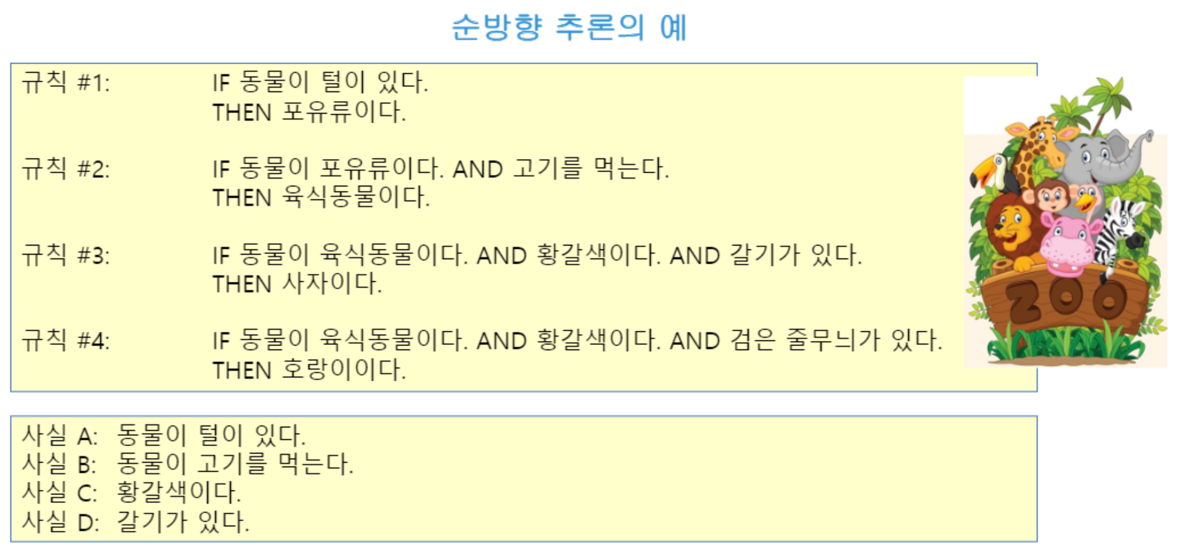 - 단기 기억장치에 있는 사실을 가지고 기존에 알던 규칙을 통해 결론을 이끌어내면 순방향 추론이다. 위의 예시에서는 네가지 사실을 가지고 사자라는 결론을 도출하게 된다.