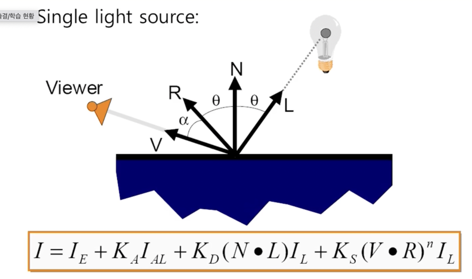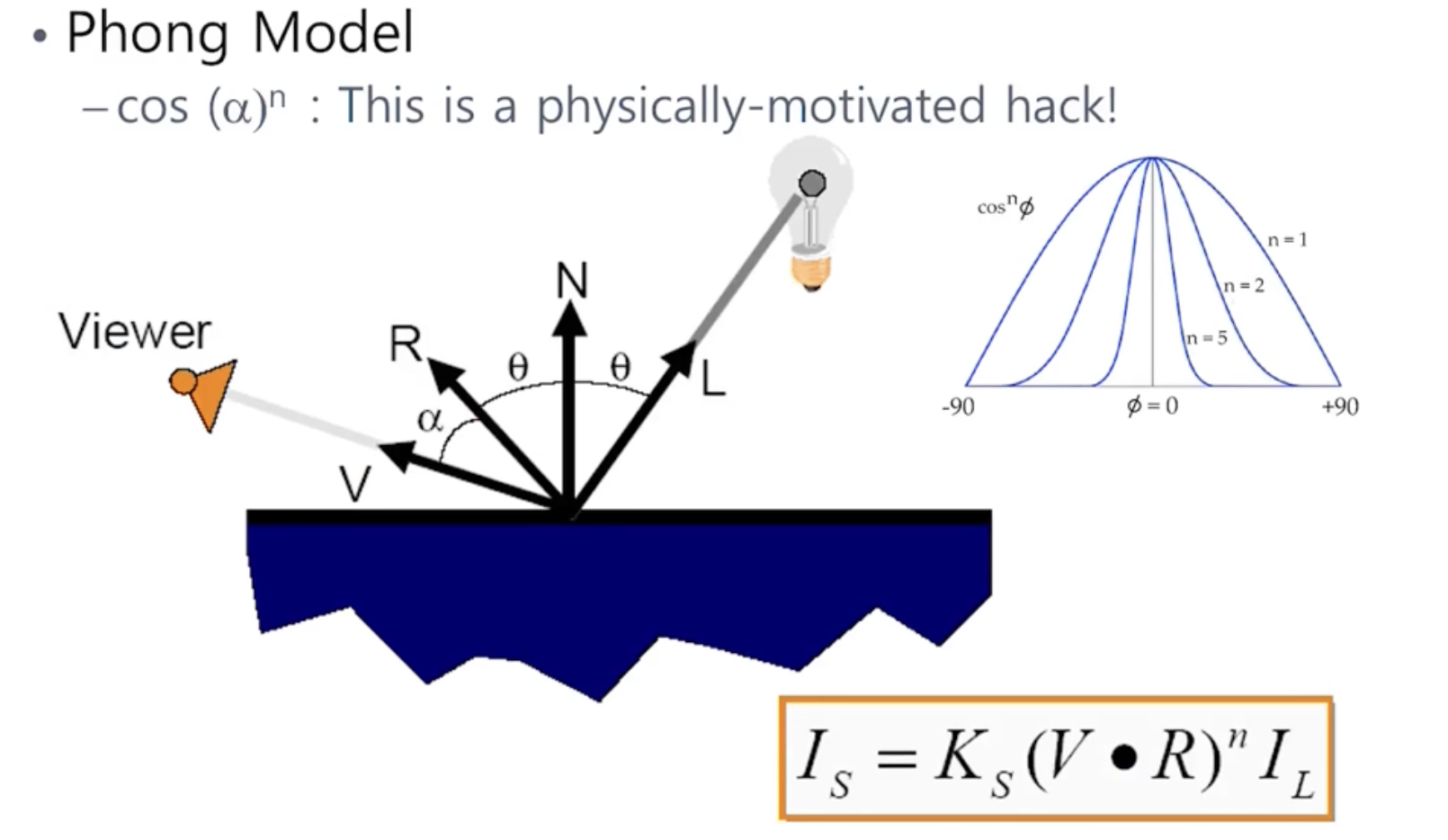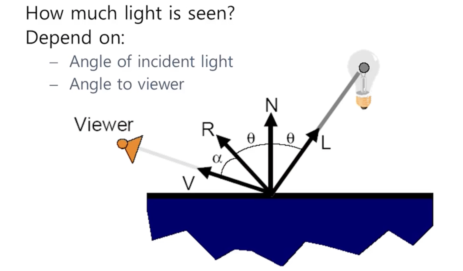 - 빛이 L방향으로 들어온다고 했을때, R로 빛이 반사되어 나올 것이다. 그럼 viewer의 위치에 따라 표면이 달라 보인다.