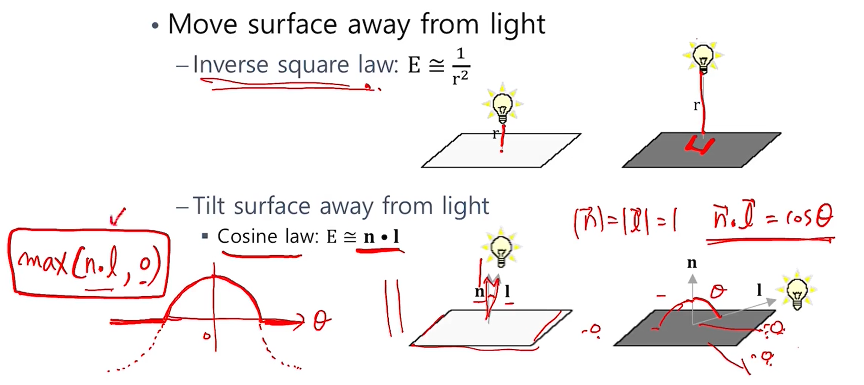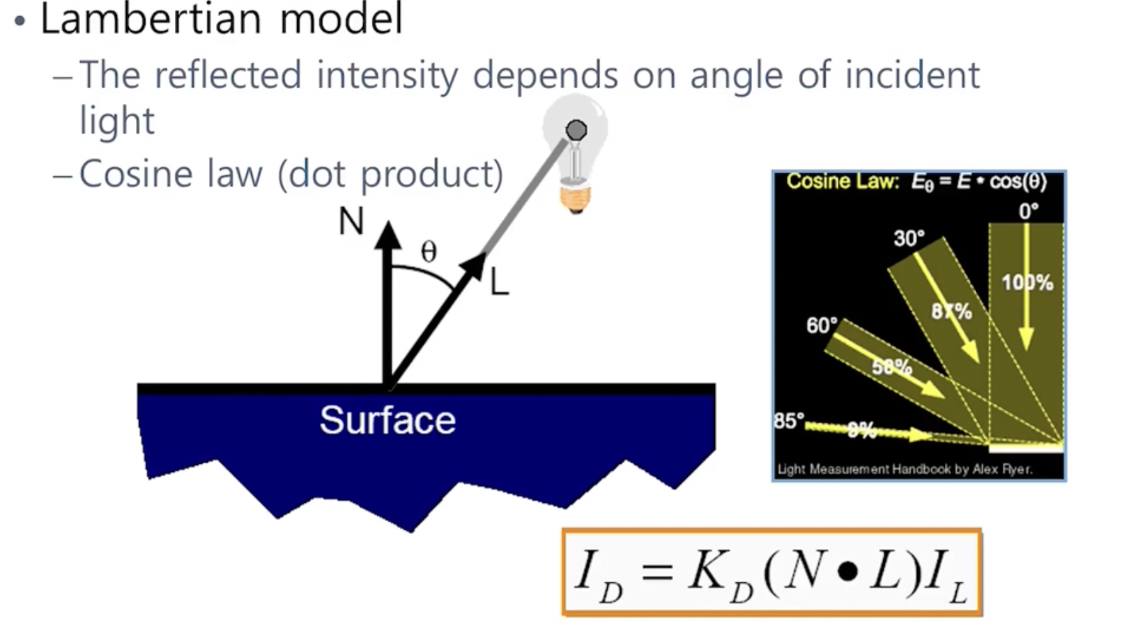 - 두번째는 비추는 각에 따른 빛의 세기 변화 이다. 비스듬하게 비출 수록 surface에 도달하는 빛의 영역이 넓어지기 때문에 빛의 강도는 줄어든다.