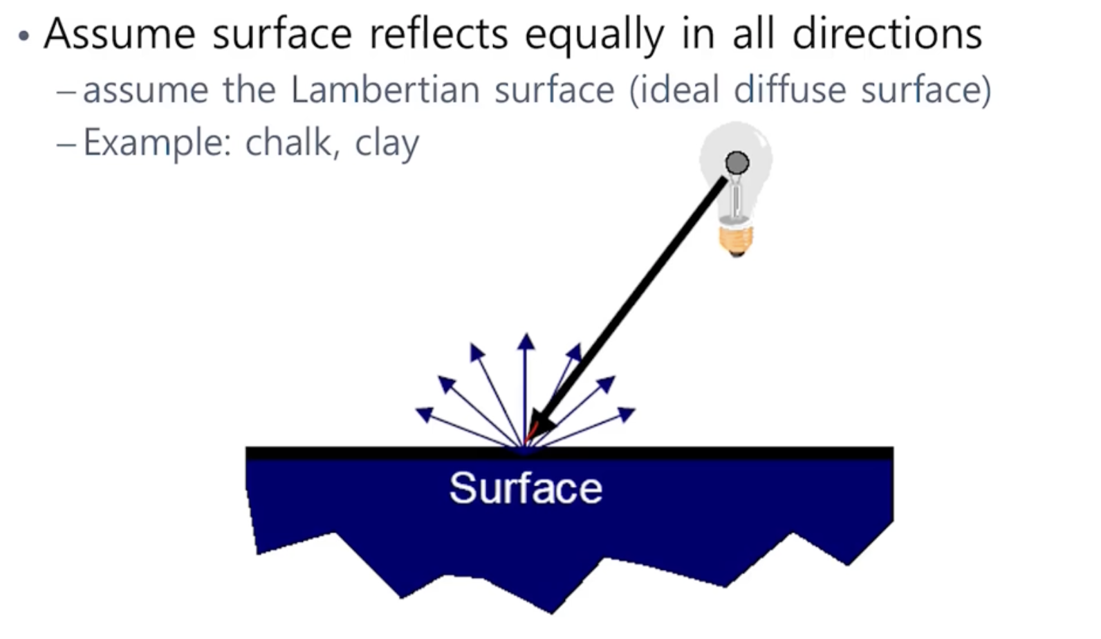 - 흡수된 빛이 모든 방향으로 반사되는 표면을 구현한다. Lambertian surface