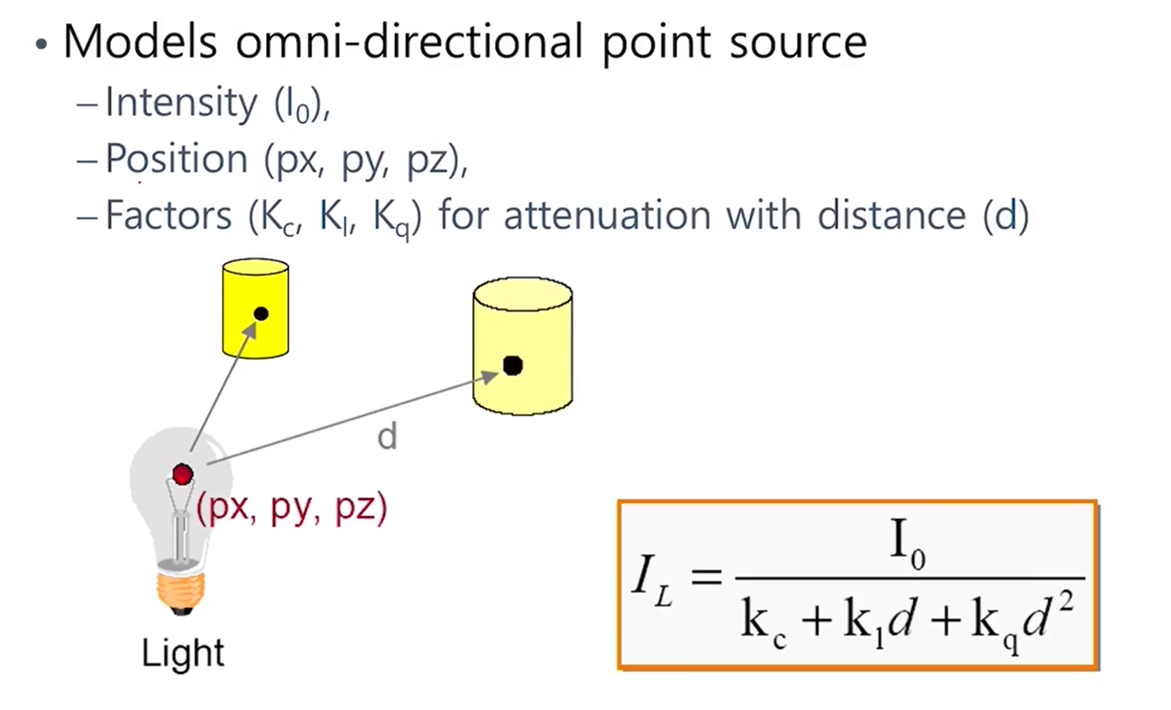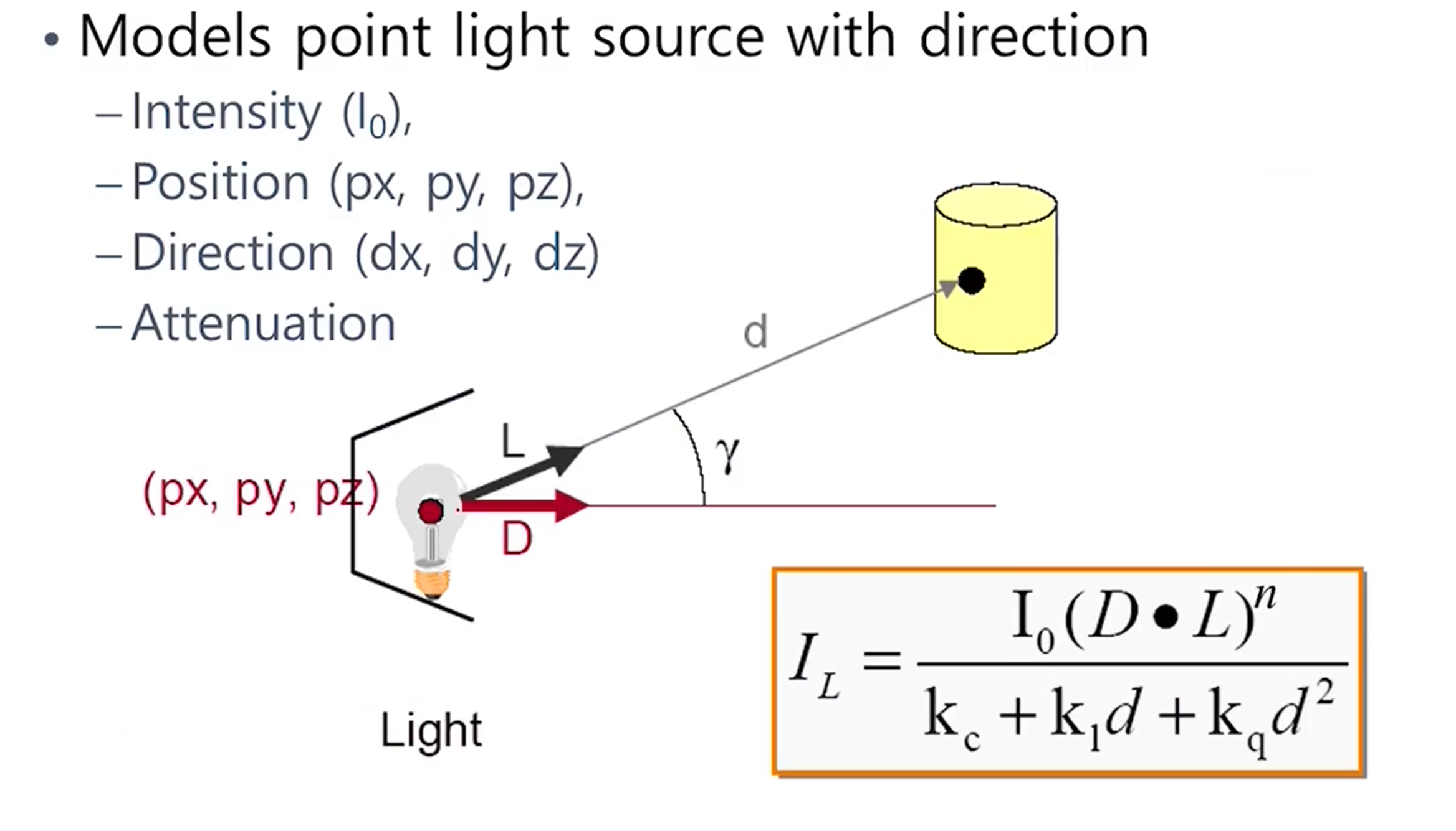 - 첫번째는 attenuation에 따른 빛의 세기 변화이다. 멀수록 거리의 제곱에 비례해서 빛의 강도가 줄어든다.
