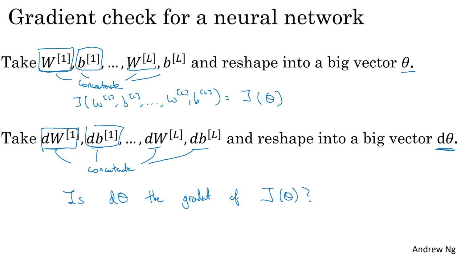 concatenate한 세타를 가지고 추정 기울기를 구한 다음 실제 gradient와 비교해서 둘의 차이가 충분히 작은지 확인하는 것이다.