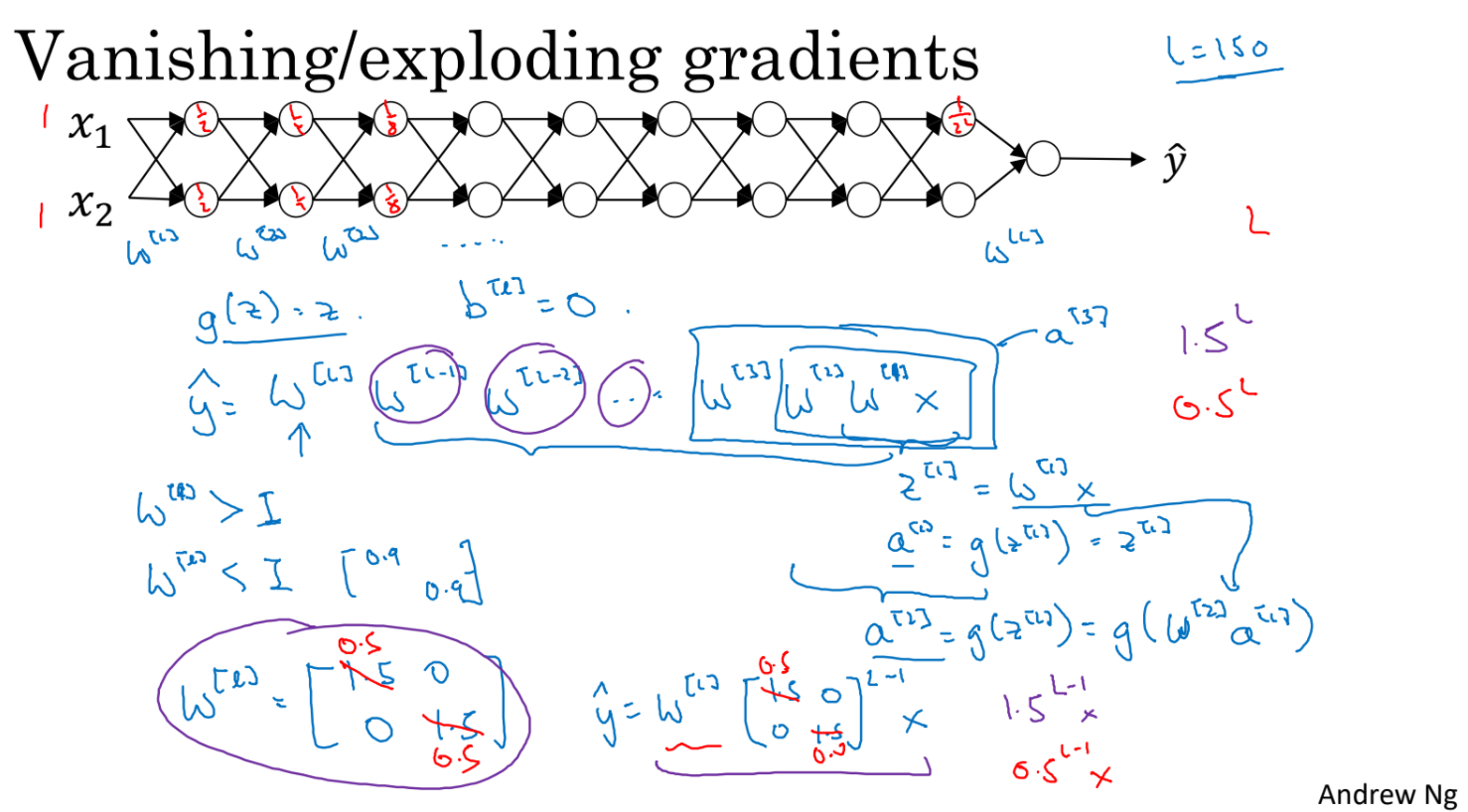 만약 w[l]의 모습이 [[1.5, 0], [0 ,1.5]]라면 y는 엄청나게 explode하게 된다.