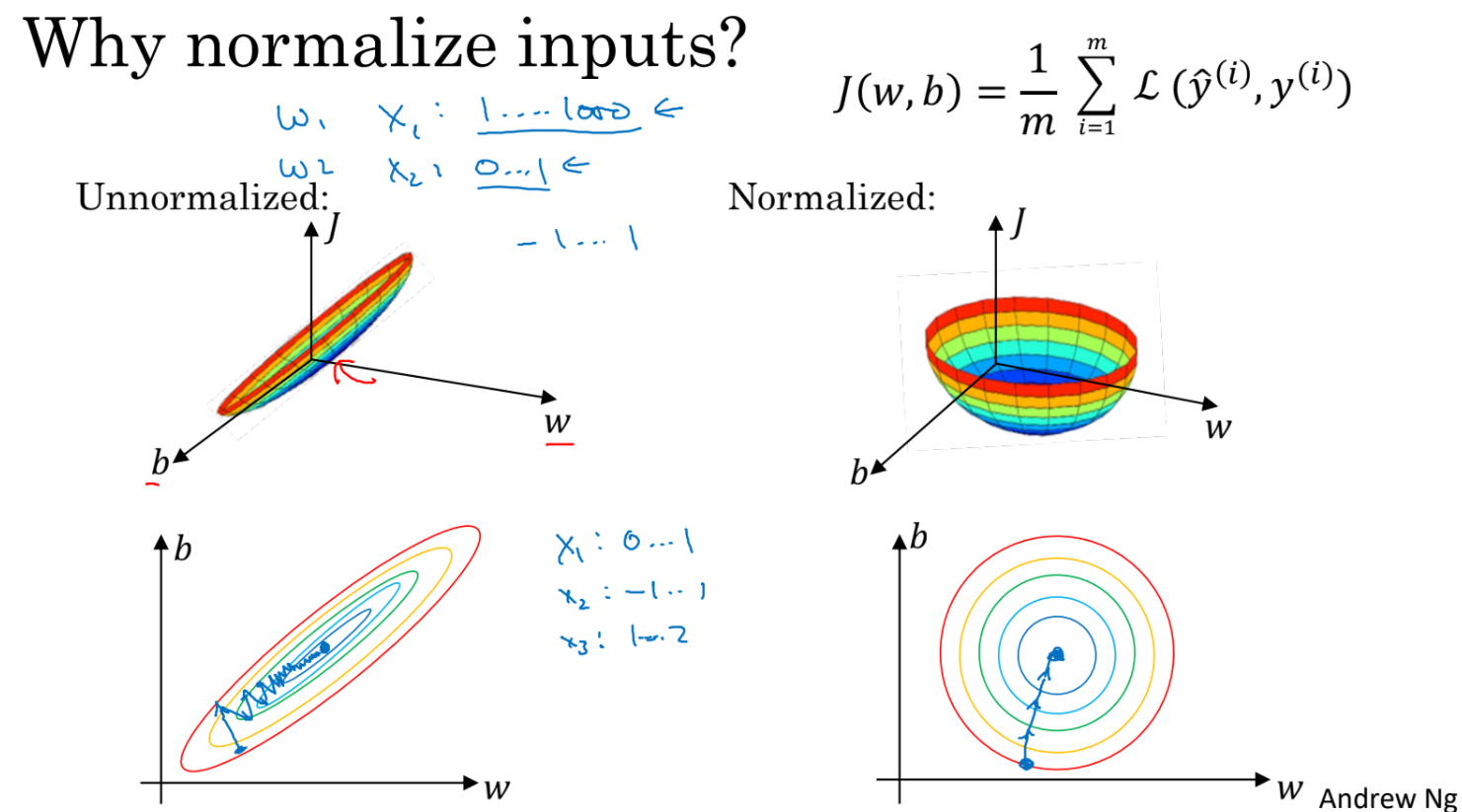 normalization을 거치지 않은 데이터와 거친 데이터에 대해 gradient descent과정을 살펴보면 다음과 같다. 더 빠르게 최적화가 진행될 수 있다.