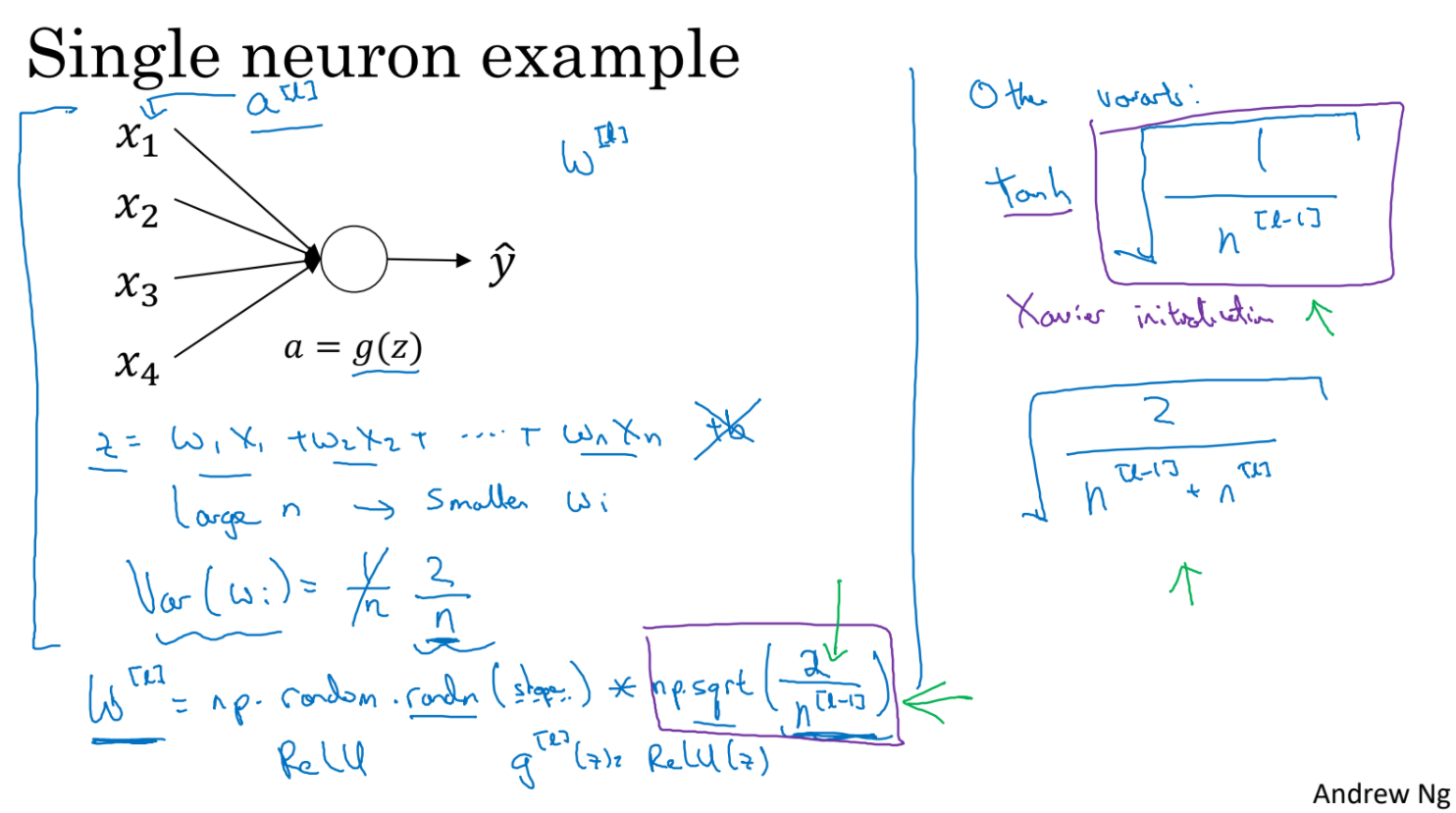 wi의 variance가 2/n이 되도록 weight를 initialize하는 것이다. ReLU를 사용한다면 왼편의 방법으로 weight를 initialize한다. 이런 방법으로 gradient의 급격한 explode나 vanish를 줄일 수 있다.