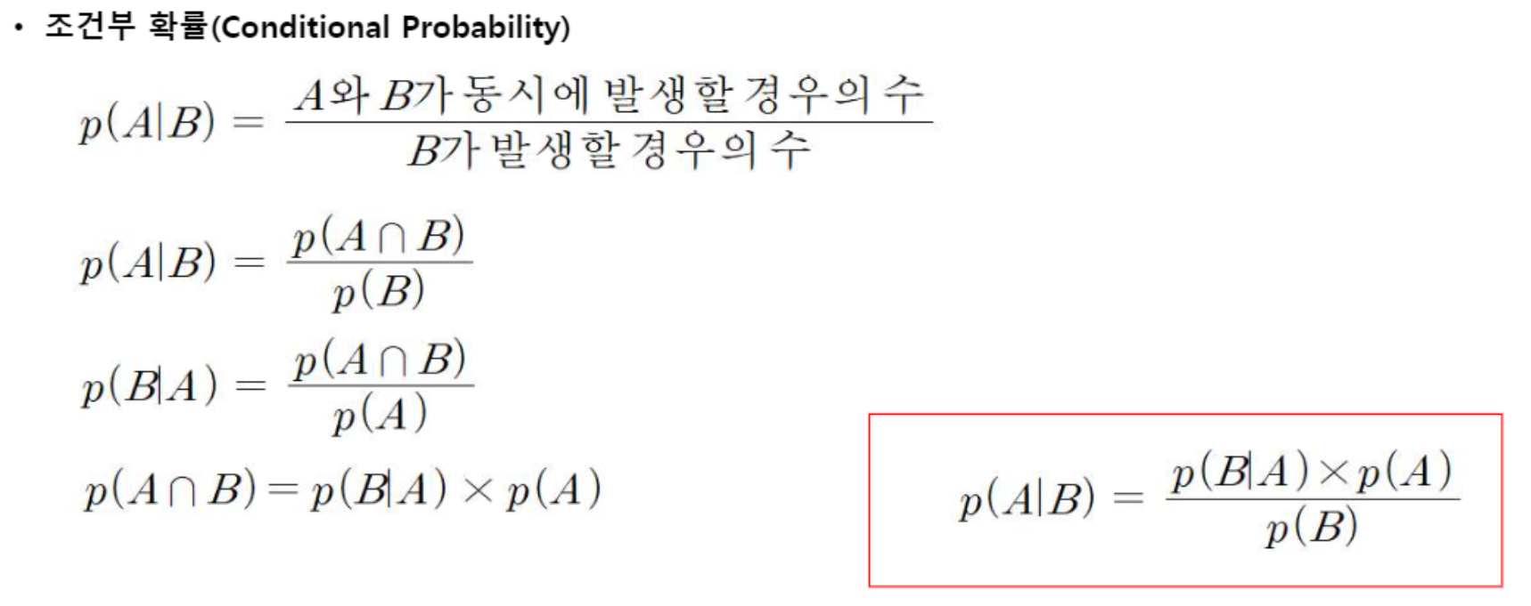 - 단 A와 B가 서로 독립인 사건에 대해서 조건부확률을 베이즈 규칙에 따라 다음과 같이 표현할 수 있다.