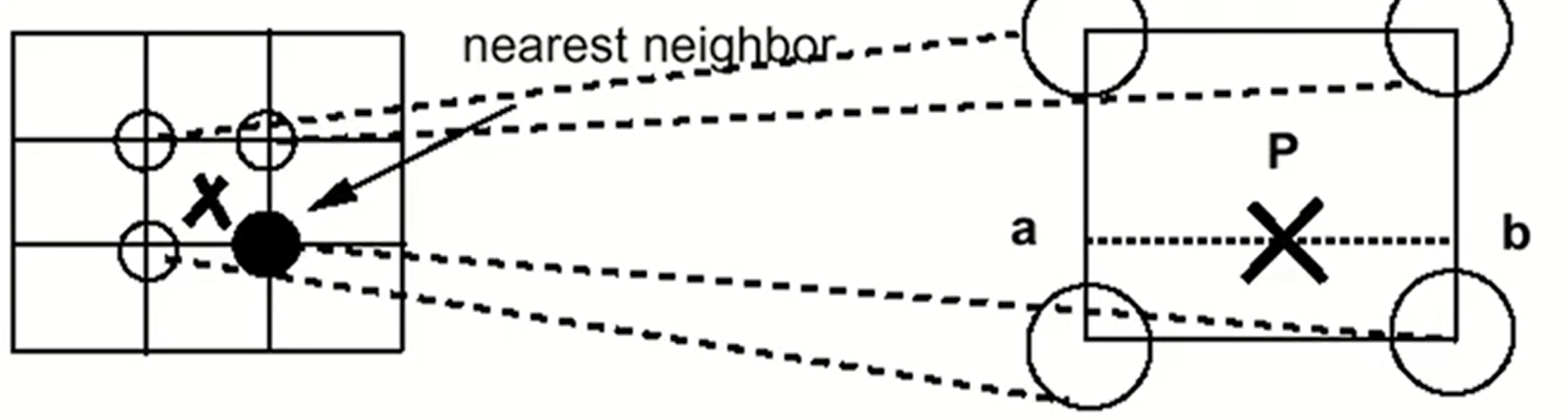 - 이전에 구한 texture coordinate(u,v)를 가지고 texture map([0.0, 1,0])에서 해당 color를 선택할때 가장 가까운 지점의 color를 고르는 방식이 nearest neighbor 방식이다.