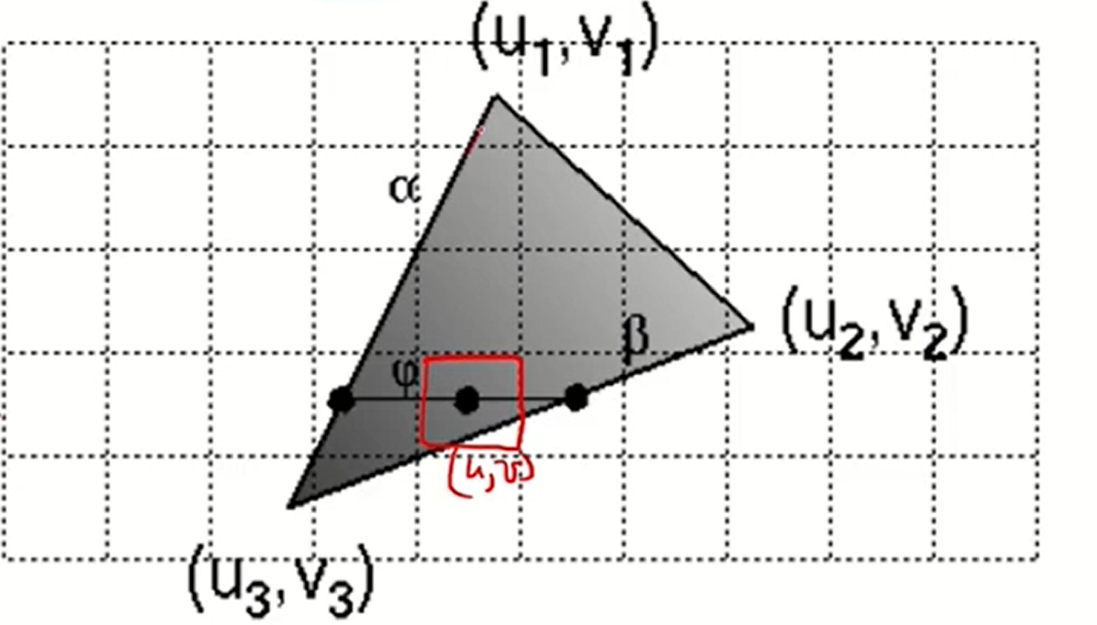 - 먼저 scan line conversion중에 각 픽셀에 대해 texture coordinate를 구한다.