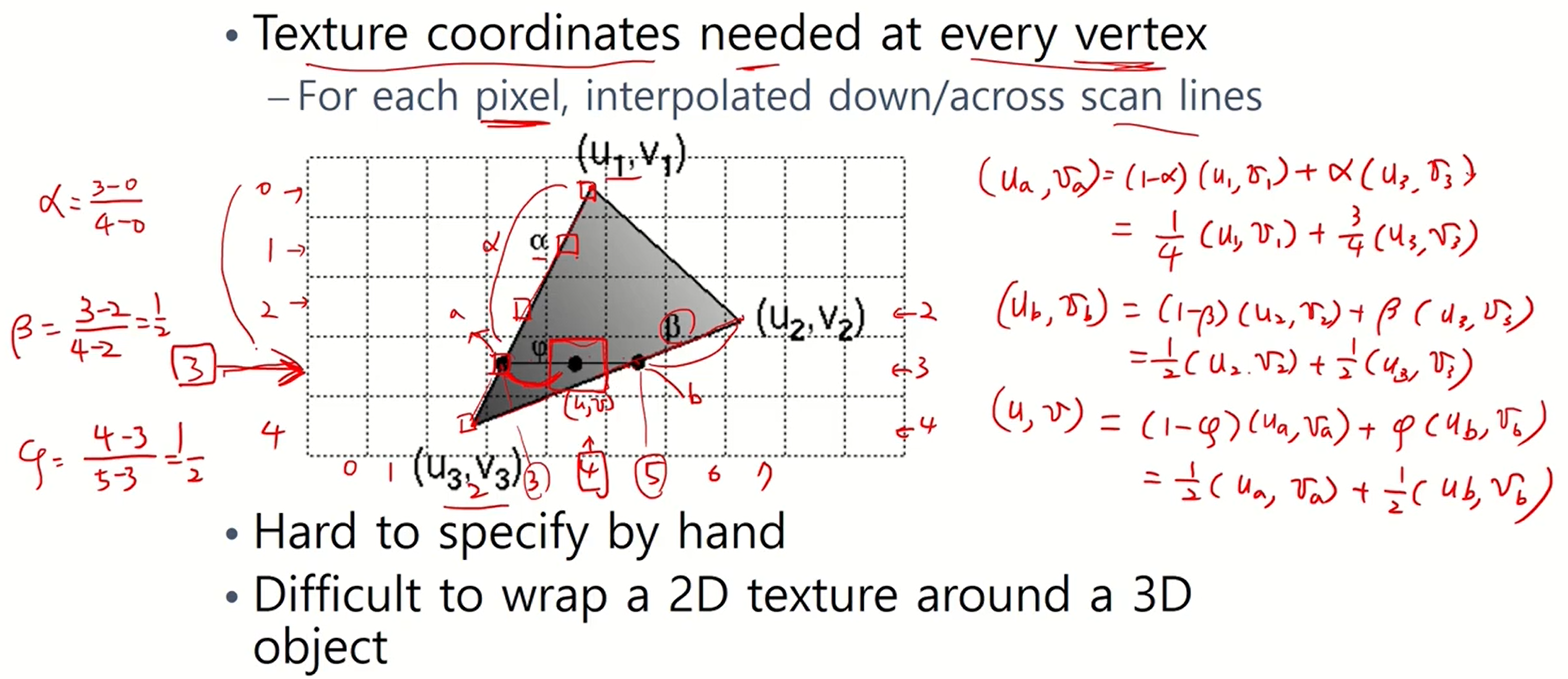 - 세 vertex의 texture coordinate를 가지고 특정 픽셀의 texture coordinate를 interpolation으로 구한다.