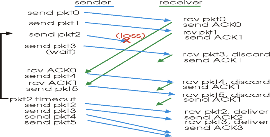 - pkt2를 다시 보낼때 2부터 5까지 다시 묶어서 한방에 보낼수도 있지만 그냥 2만 보낼 수도 있다. 왜냐하면 어차피 pkt3 timeout도 걸려있기 때문에 이어서 pkt3을 보내게 되어있다.