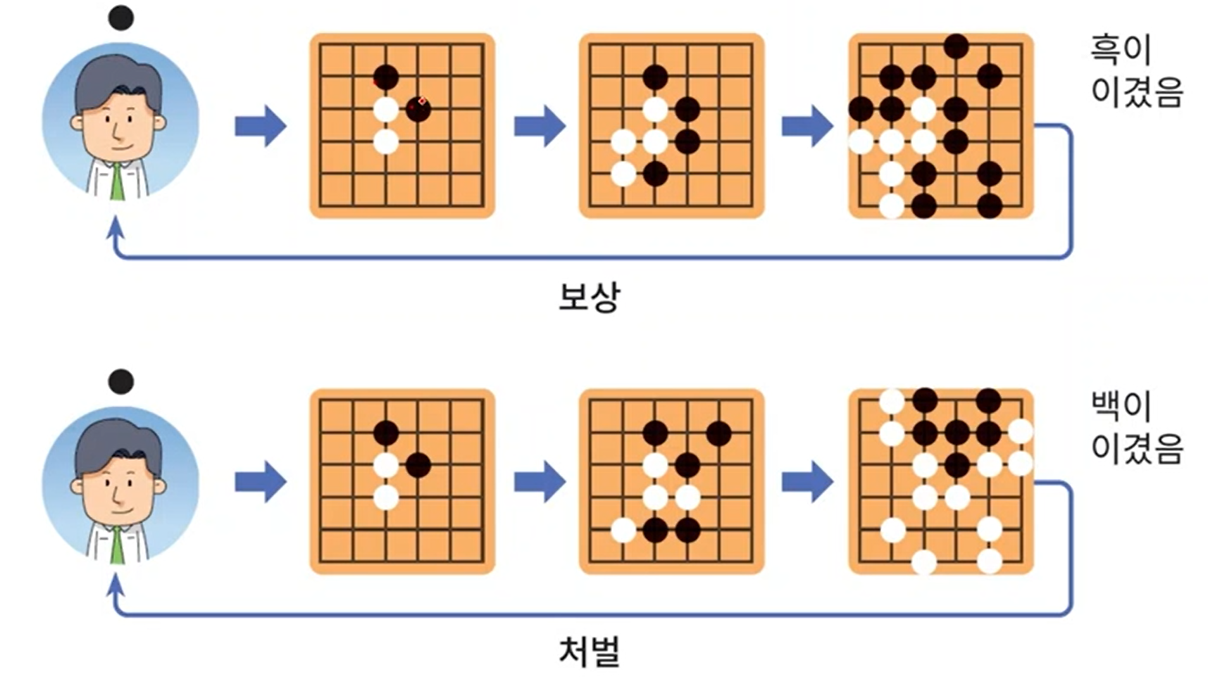 - 컴퓨터는 보상이 좋은 선택을 하도록 설정되어있고 컴퓨터가 하는 선택에 따른 피드백을 주어 학습하는 것이다.