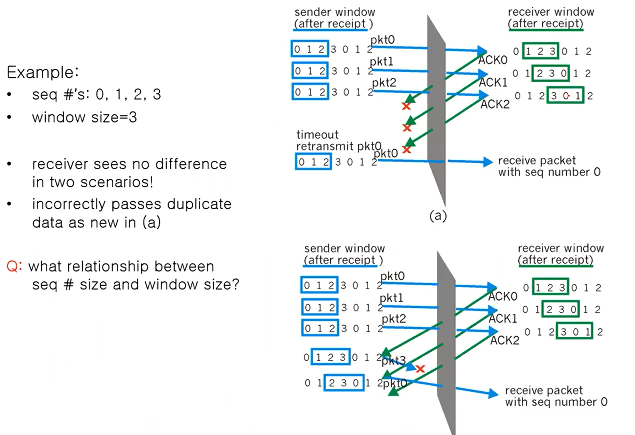 - 우리는 송신,수신 그림을 모두 보고있기 때문에 상황을 알 수 있지만 수신자 입장에서는 pkt0을 받았을 때 이게 재전송된건지, 다음번 pkt0인지 구분을 할 수가 없다.