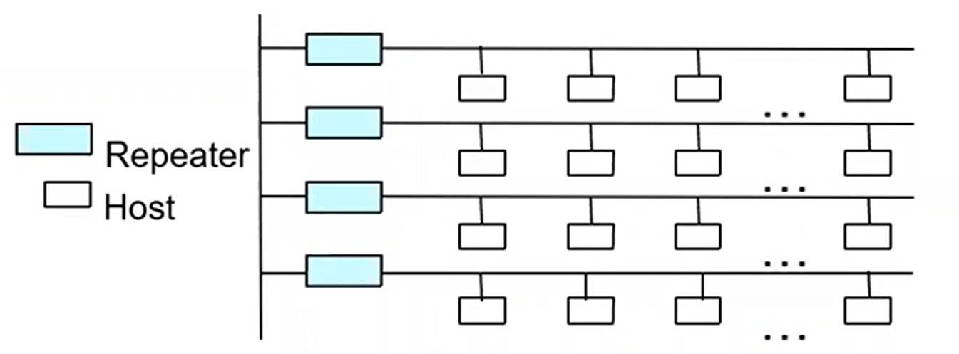 - 이더넷은 버스 토폴로지로 구성된다. 케이블의 한계를 극복하기 위해 repeater를 활용한다.