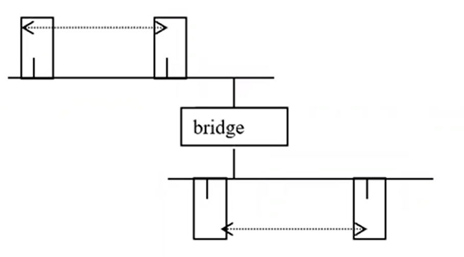 - 두 링크를 브릿지로 연결한다. 만약 위에 링크에 출발 노드와 도착 노드가 존재하면 브리지는 아래 링크와 연결을 막는다. 이를 filtering이라고 한다. 반대로 위에 노드에서 아래 노드로 전달될때는 링크를 연결한다. 이렇게 repeater보다 더 똑똑하게 switch기능을 수행한다.
