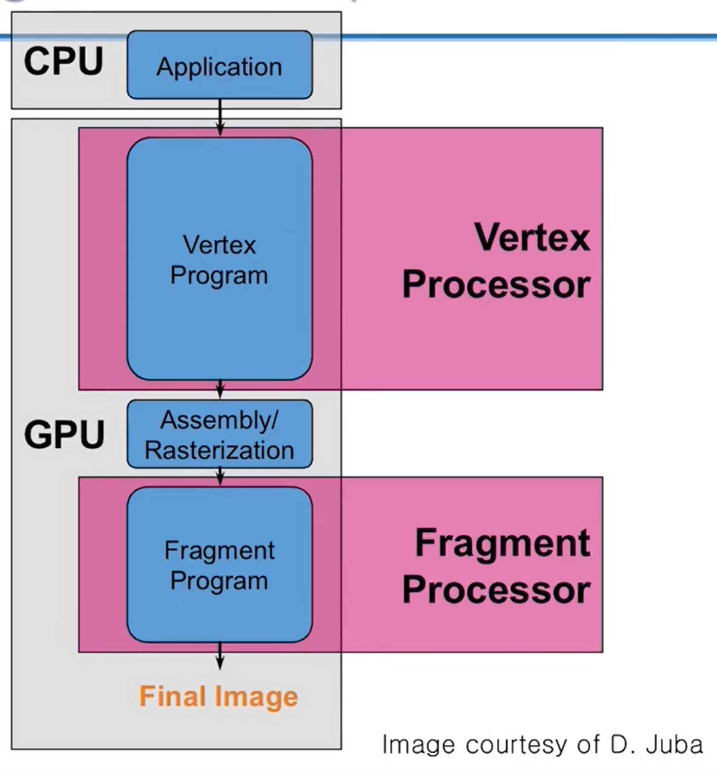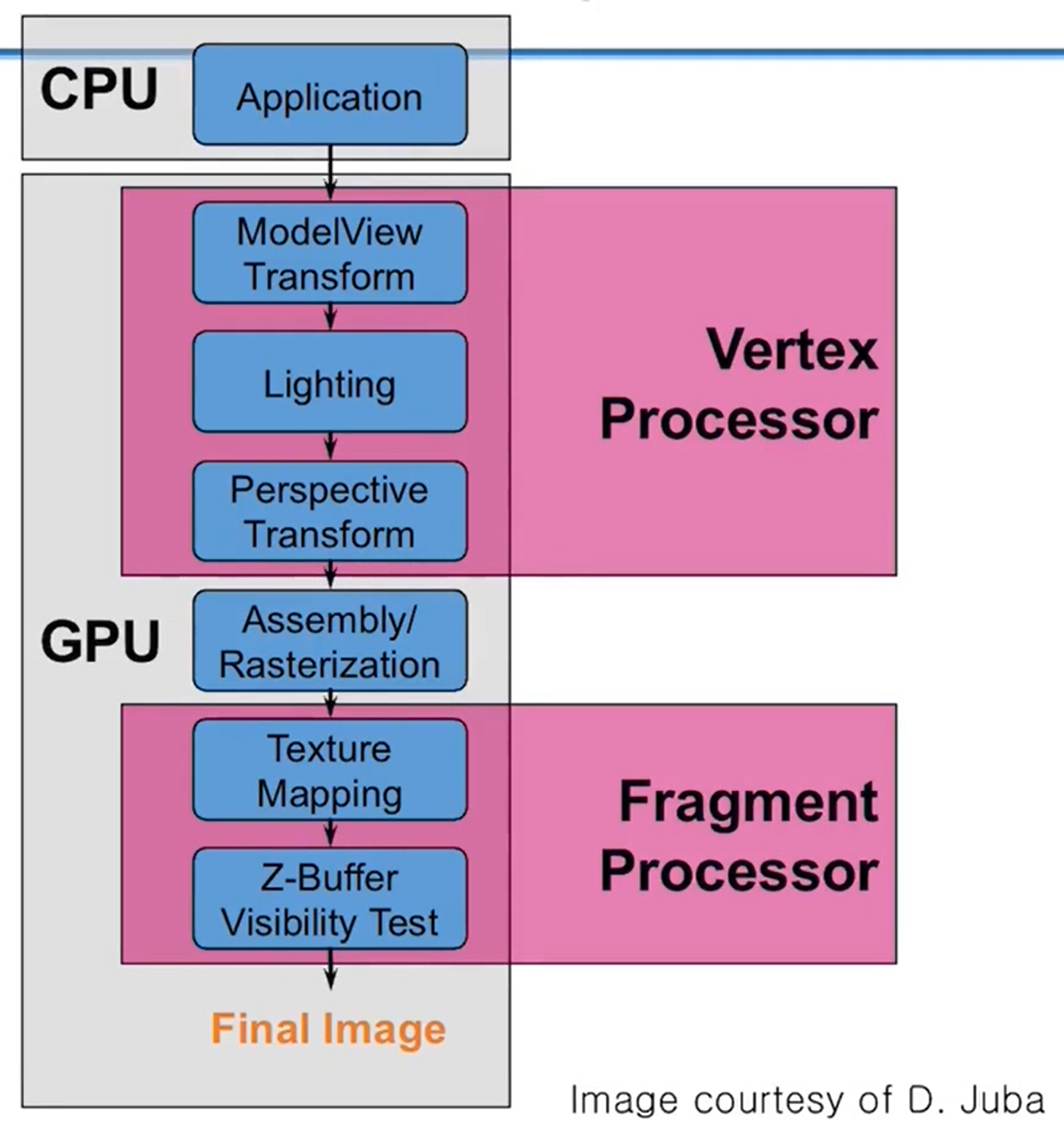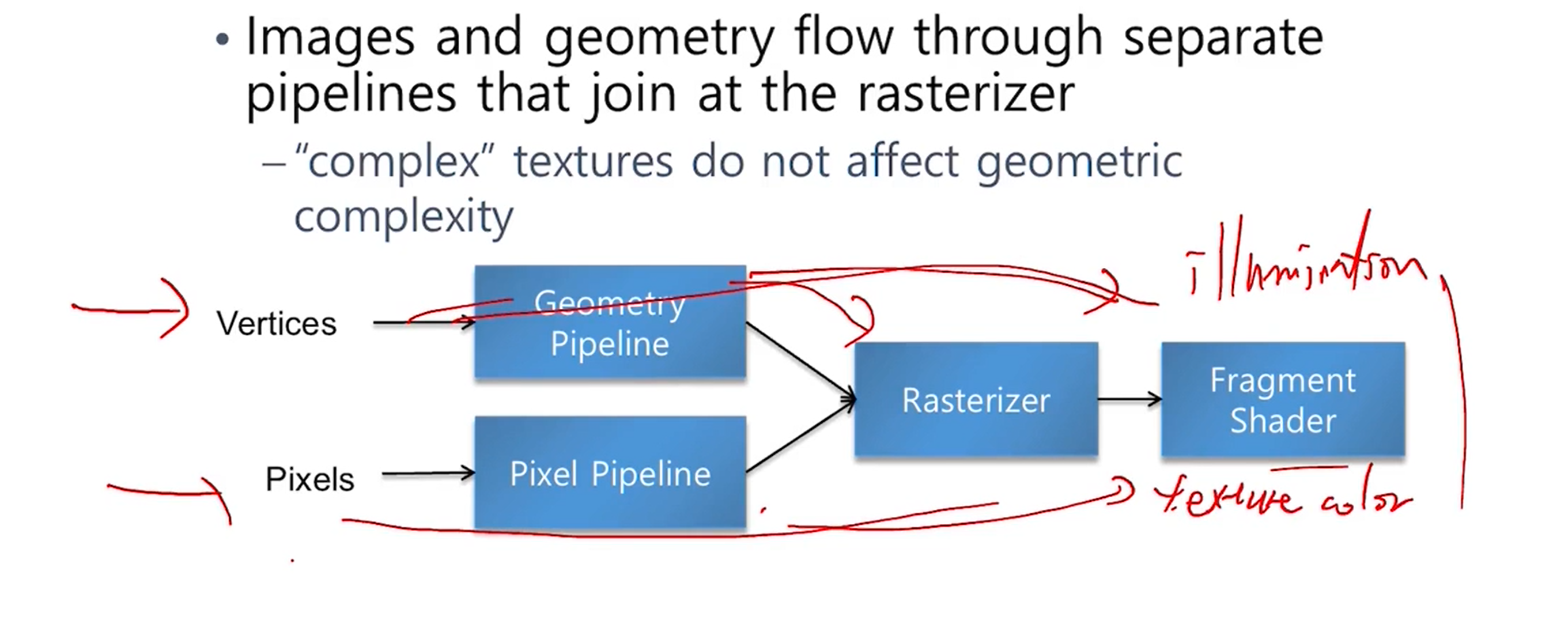 - geomety pipeline에서 넘어온 illumination color, pixel pipeline에서 넘어온 texture color를 fragment shader에서 합쳐서 최종 픽셀의 컬러를 계산하게 된다.