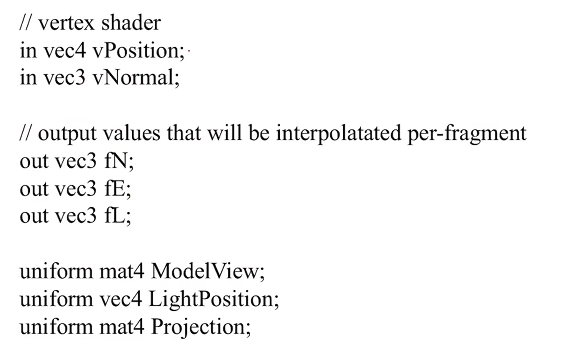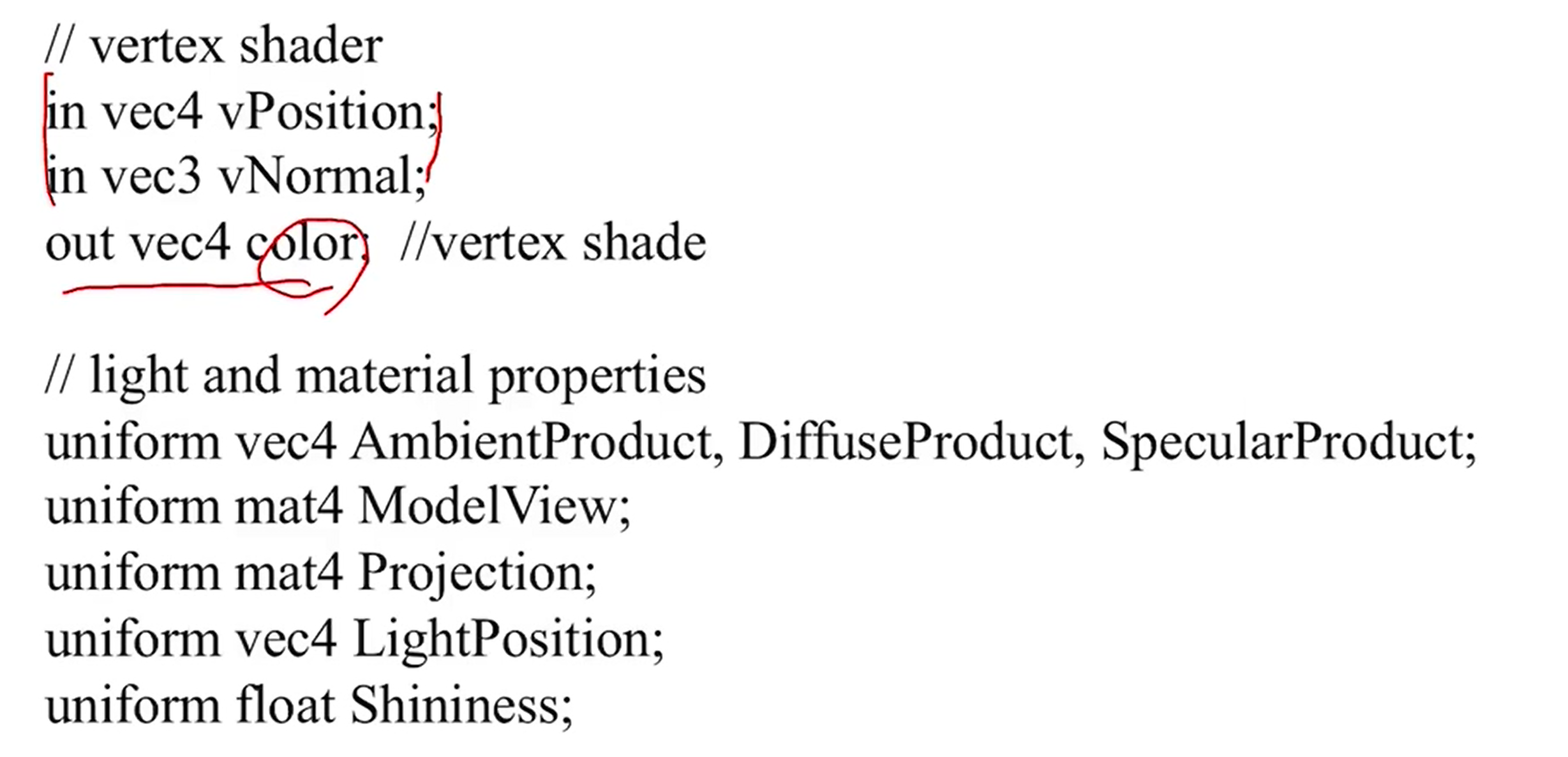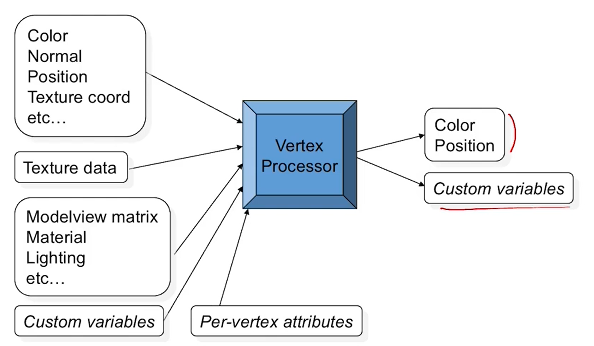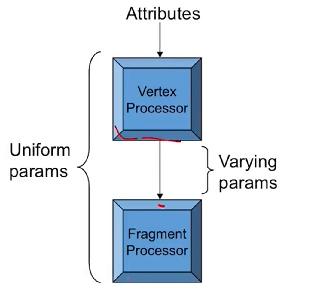 - 그 외에도 texture data, illumination을 위한 parameter들 model view matrix등의 global data도 입력으로 주어질 수 있다. uniform으로 모든 vertex들이 공유할 수 있게 한다.