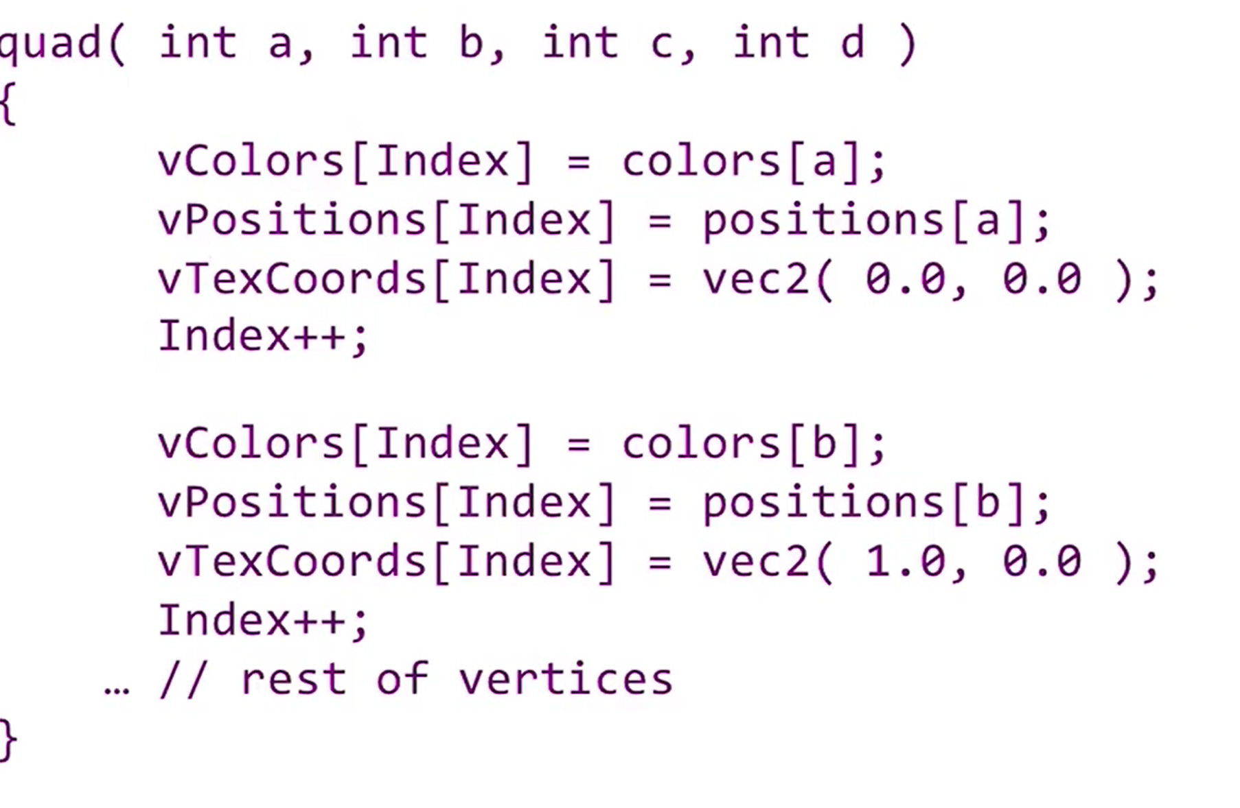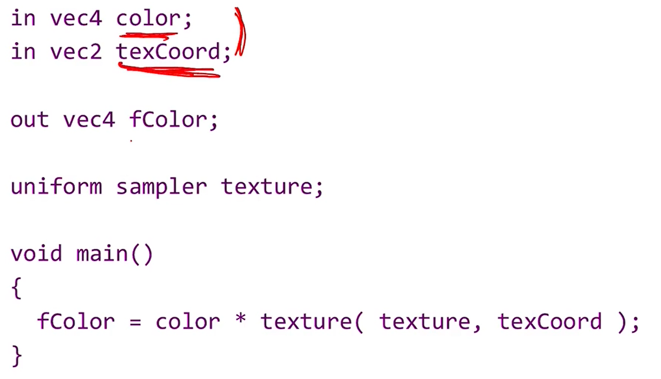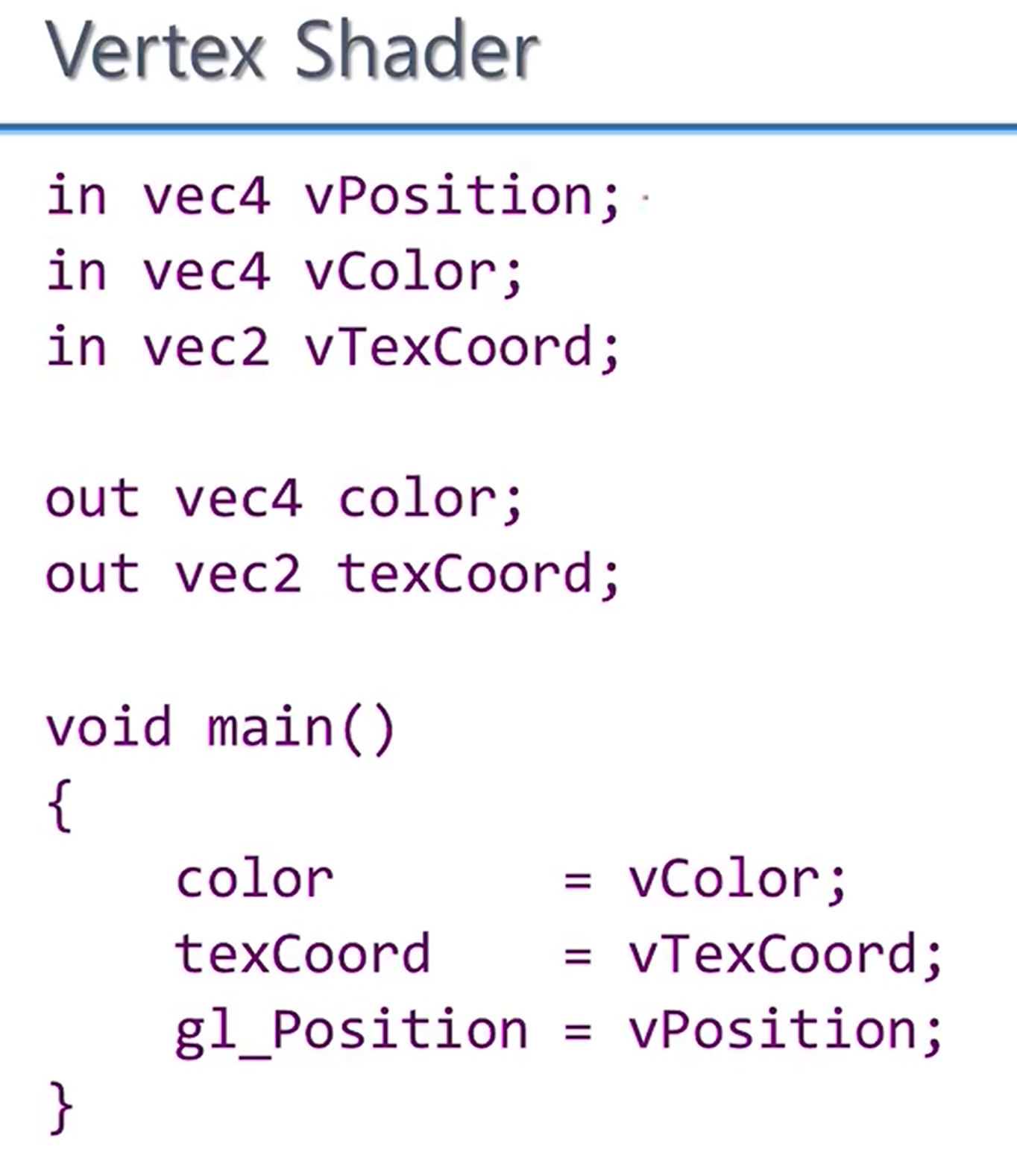 - vetex마다 변하는 값들을 input으로 받고 output은 color, texCoord가 된다.