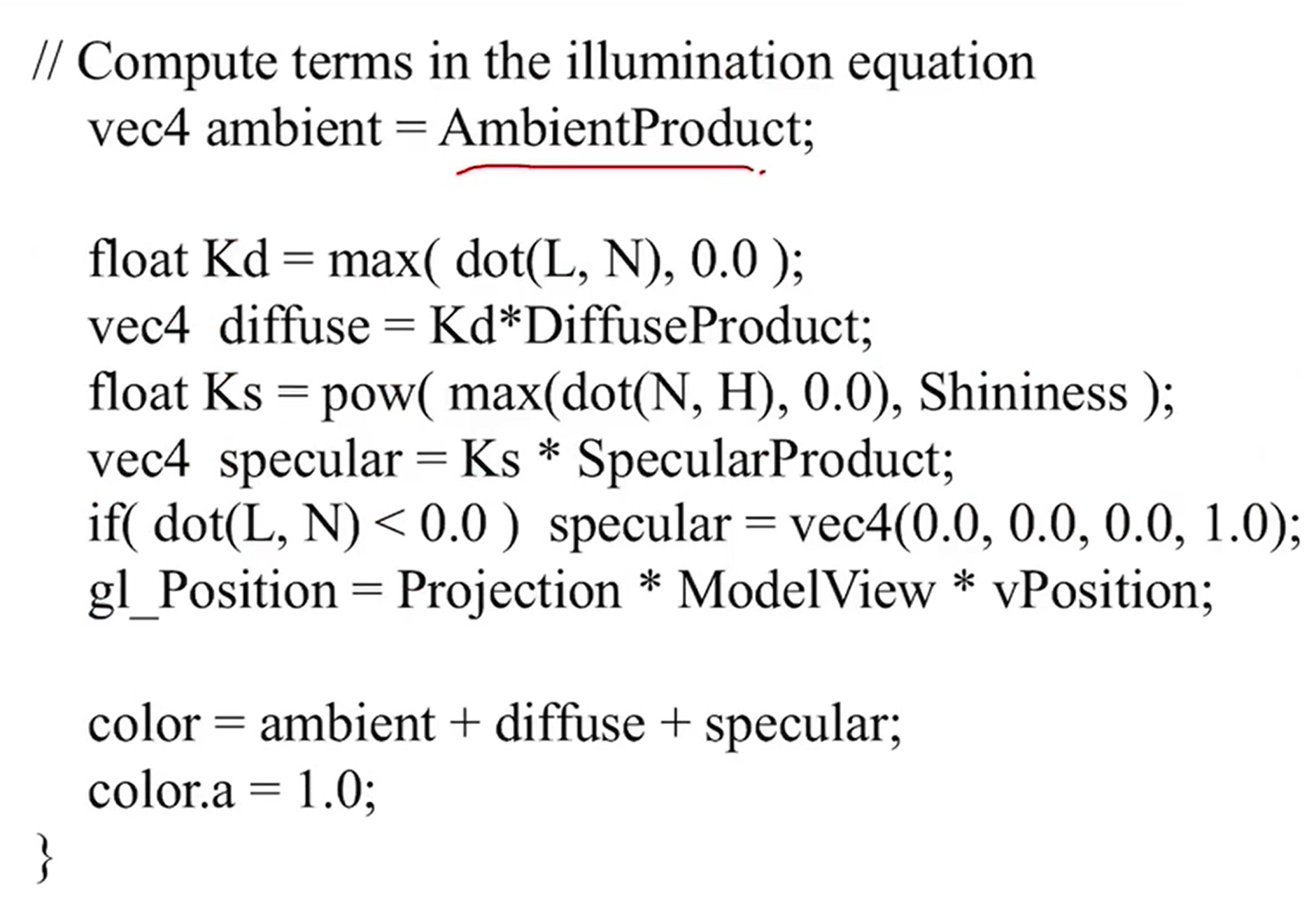 - vertex에서 illumination을 계산해서 output으로 준다. 그럼 그것들을 interpolation해서 픽셀의 색을 결정한다.