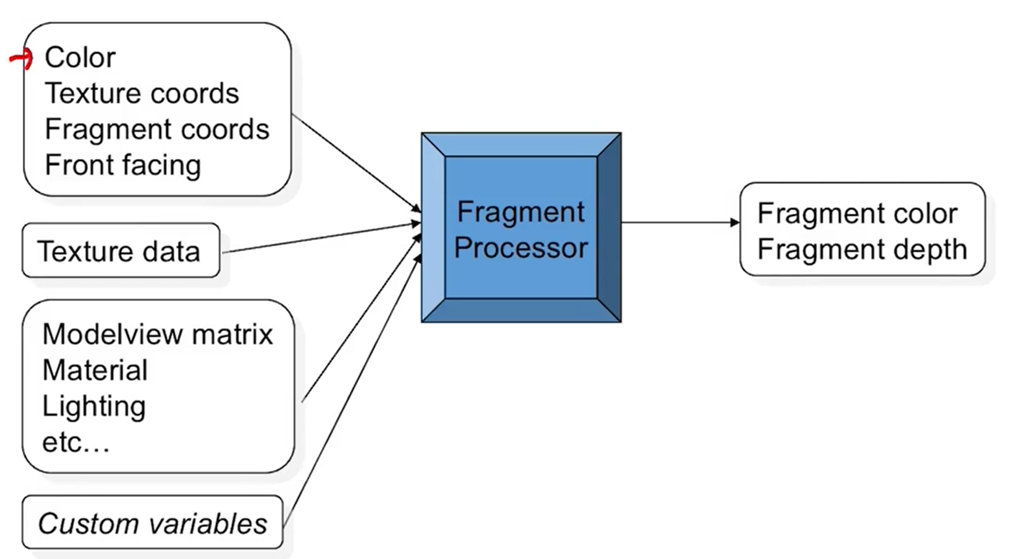 - 각 픽셀마다 가지고 있는 색, 질감좌표 등이 input으로 들어온다. 이 값들은 vertex shader로 부터 건네받은 output이다.