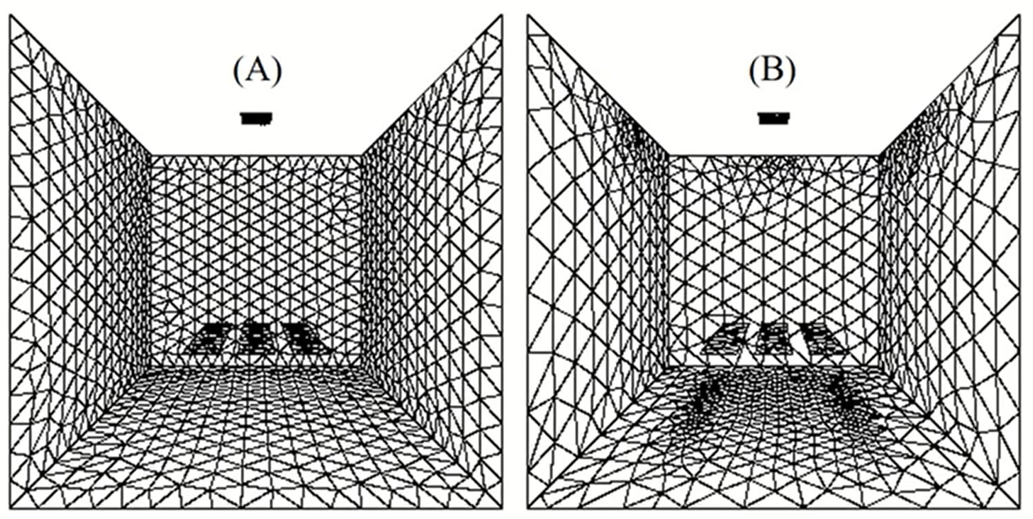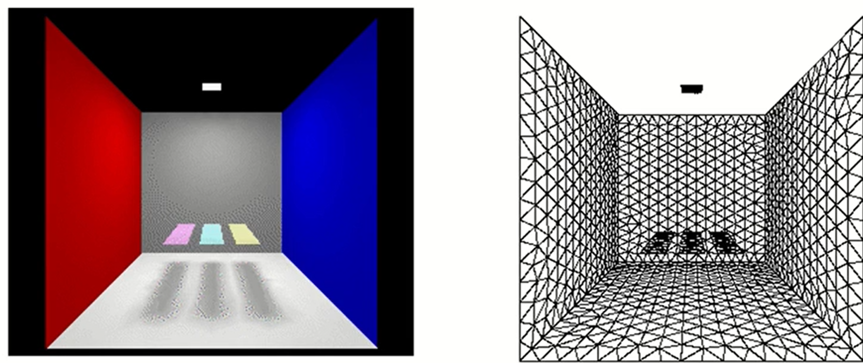 - 그림자가 생기는 바닥면이랑 light source와 가까운 벽면은 더 작은 삼각형들로 patch가 쪼개져있다.