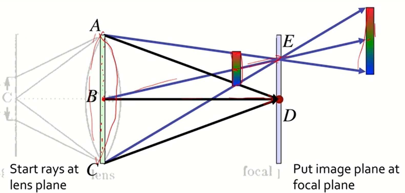 - 실제로 렌즈가 있다고 가정하고 여러 ray를 쏜다 아래 예시는 3개를 쏘았다.