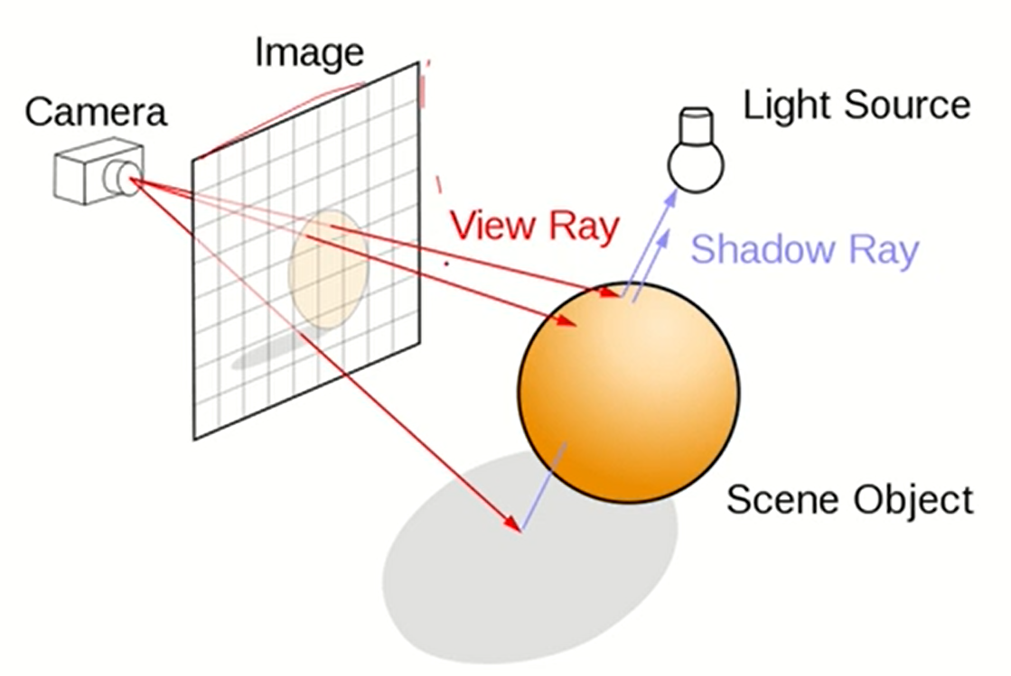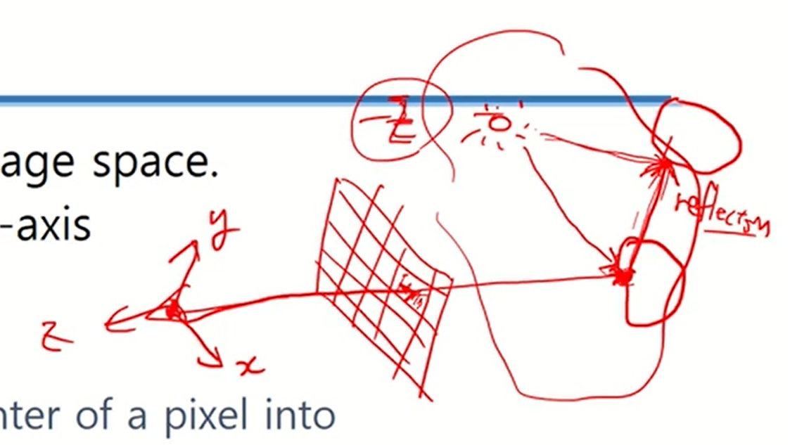 - 카메라에서 모든 frame buffer에 있는 image의 pixel에 빛을 쏴서 닿는 곳에서 색을 계산하는 것이다.