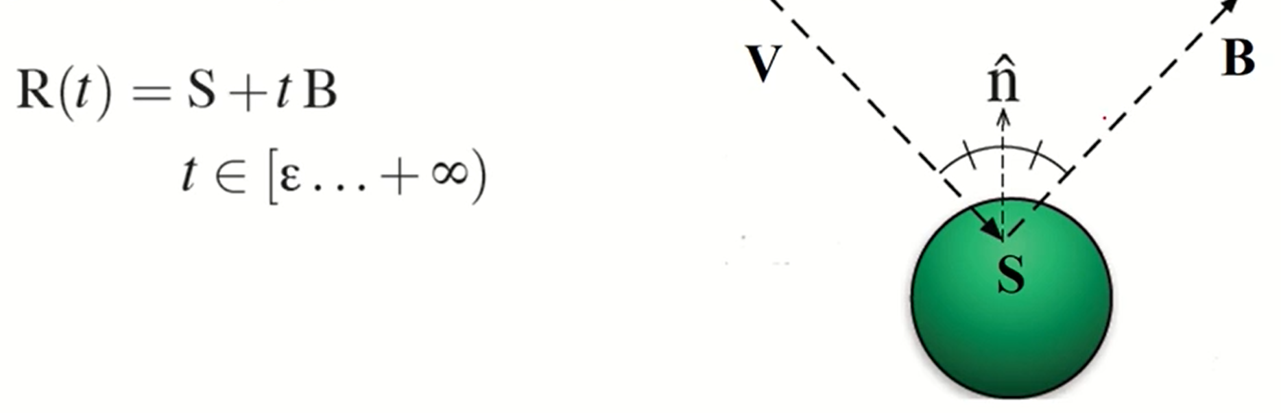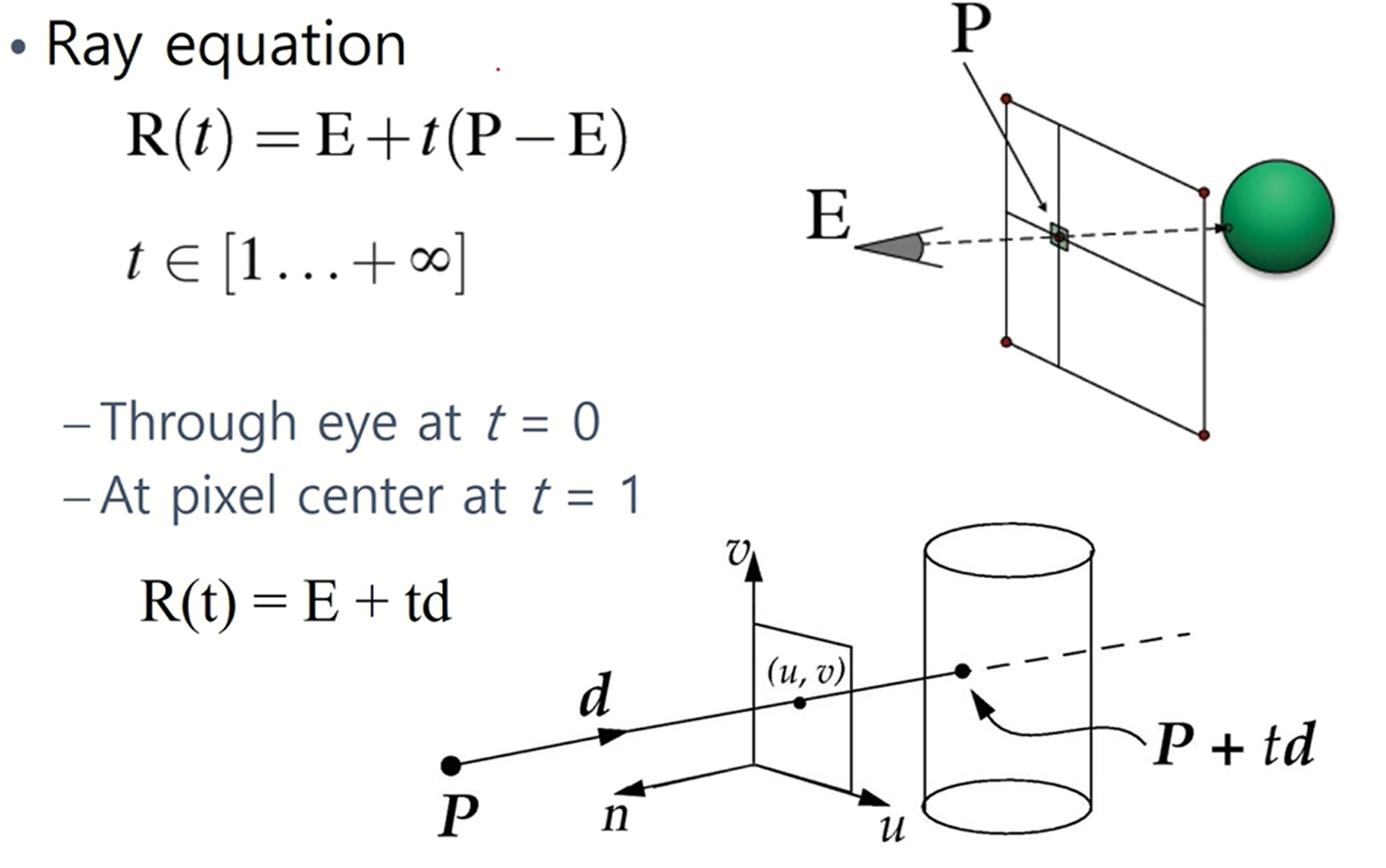 - E에서 나오는 ray를 직선의 식으로 표현하면 위와 같다. 눈 위치가 t=0, pixel위치가 t=1이 된다.
