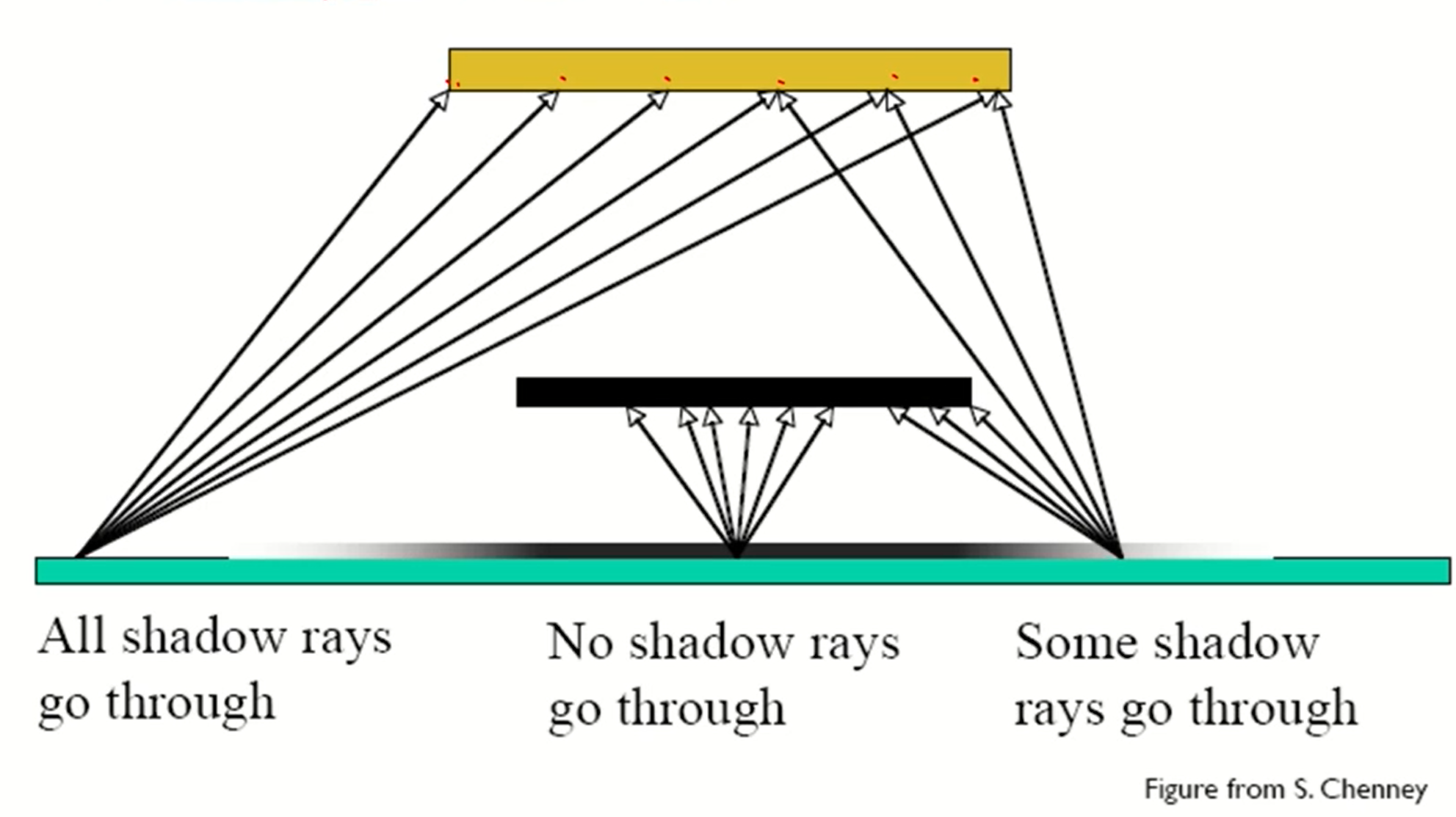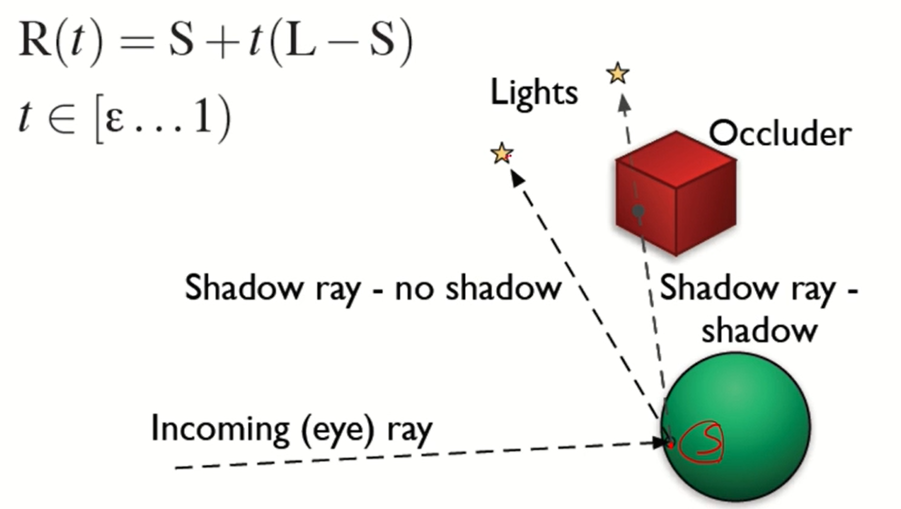 - ray가 닿은 지점에서 광원으로 가는 길에 물체가 있다면 그곳이 그림자가 져아함을 알 수 있다.