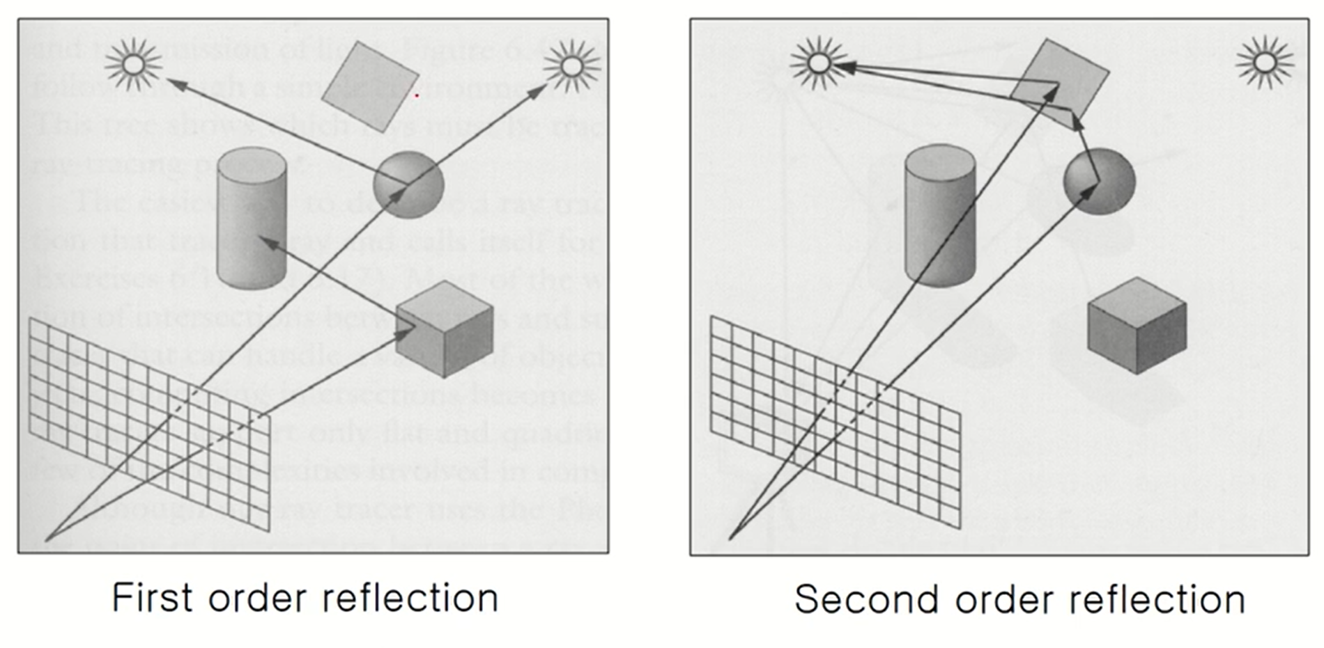 - 광원의 직접적인 빛뿐만 아니라 모든 물체들간에 반사되는 빛을 고려하여 simulating하는 방법이다.