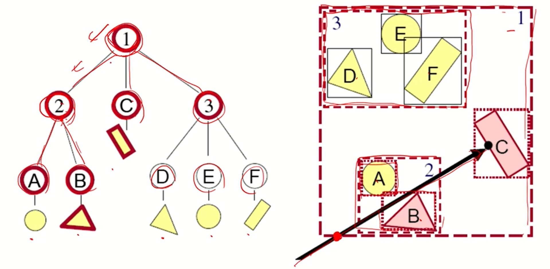 - 위의 예시에서는 ray가 2와 먼저 만난다. 그 다음 A,B중 B와 만나는걸 확인하고 삼각형의 모든 traingle mesh와 교점이 있는지 찾는다. 없기 때문에 다음 C를 찾아간다. c와 교점이 있기 때문에 사각형의 모든 triangle과 교점이 있는지 확인한다.